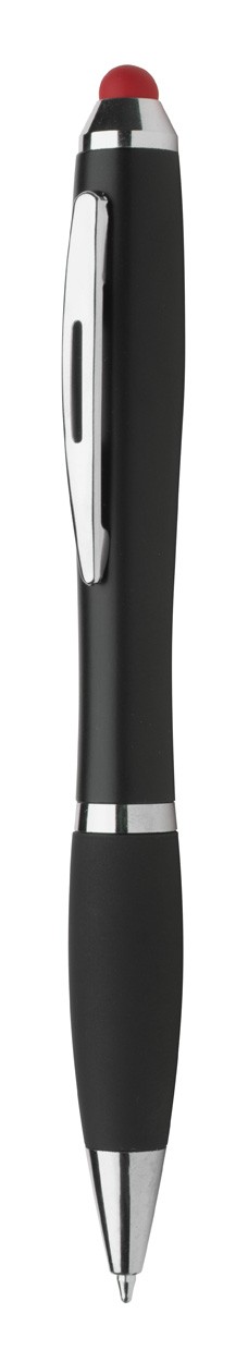 Pix negru din plastic, cu touch, dispozitiv de prindere cauciucat, cu LED colorat pentru gravură iluminată. Lumina poate fi activată prin apăsarea butonului. Se livrează cu baterie, mină albastră.