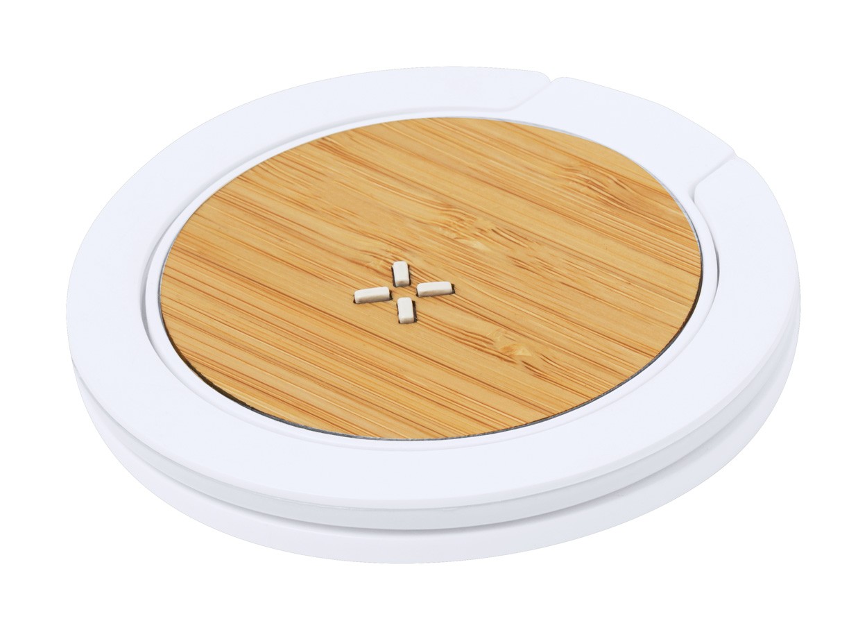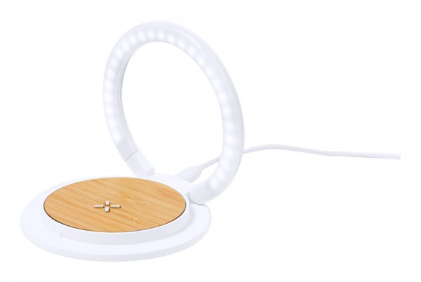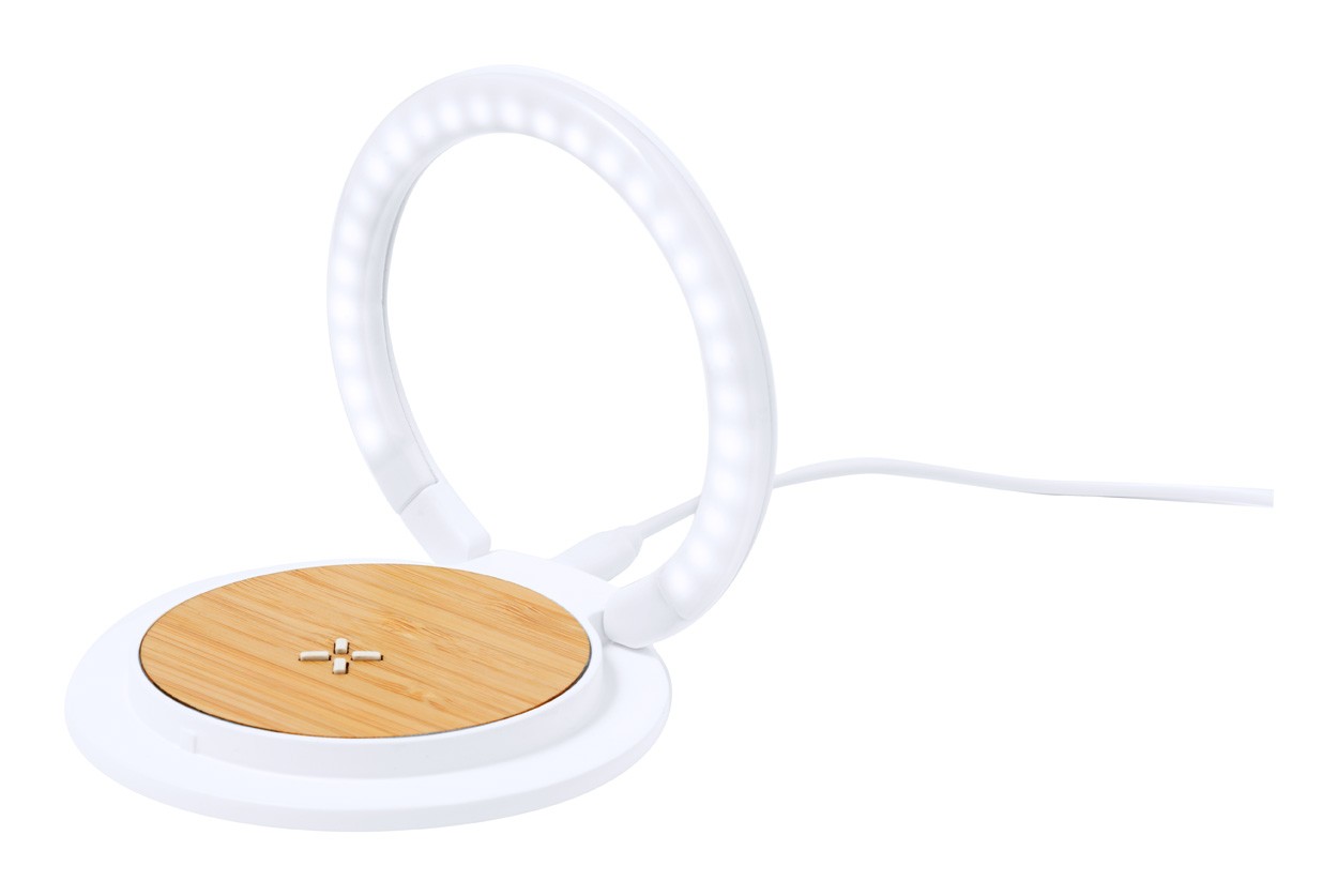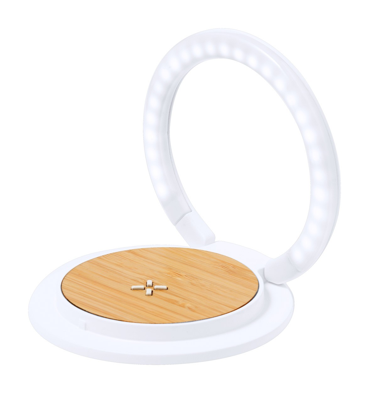 Foldable, multifunctional bamboo desk lamp in ABS plastic and bamboo, with 27 LEDs. With built-in wireless fast charger (15W) and USB charger port. Including USB charger cable.