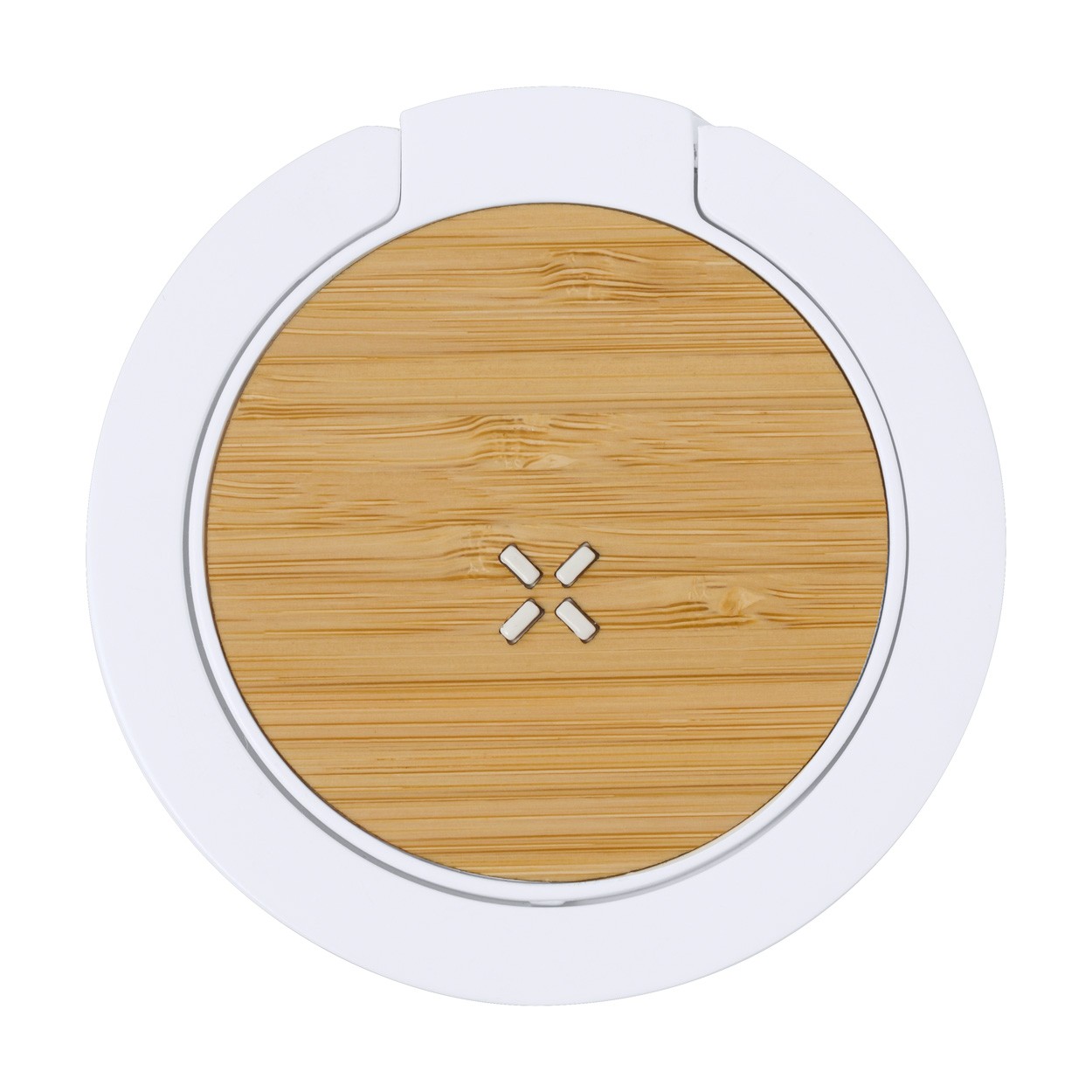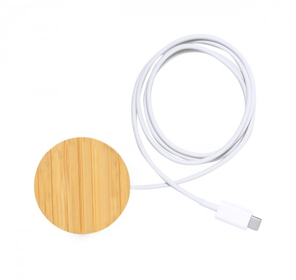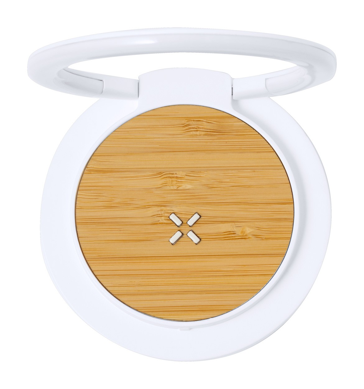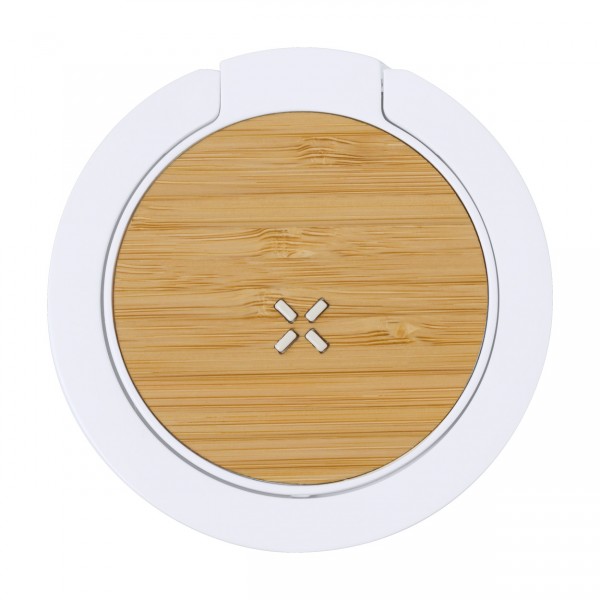 Foldable, multifunctional bamboo desk lamp in ABS plastic and bamboo, with 27 LEDs. With built-in wireless fast charger (15W) and USB charger port. Including USB charger cable.
