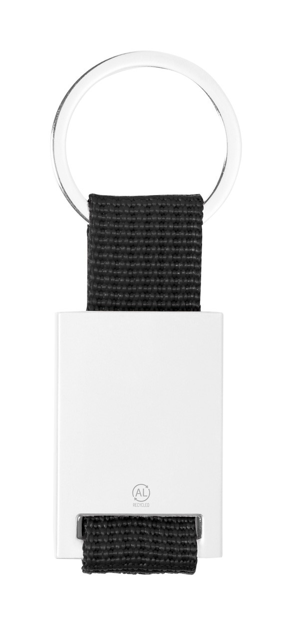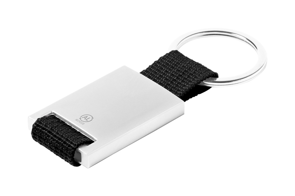 Breloc dreptunghiular, din aluminiu reciclat, cu curea din poliester și inel metalic.