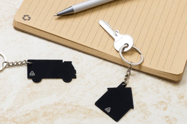 Breloc din oțel inoxidabil reciclat, în formă de camion, cu finisaj cauciucat. Cu acoperire specială pentru gravarea laser în oglindă.