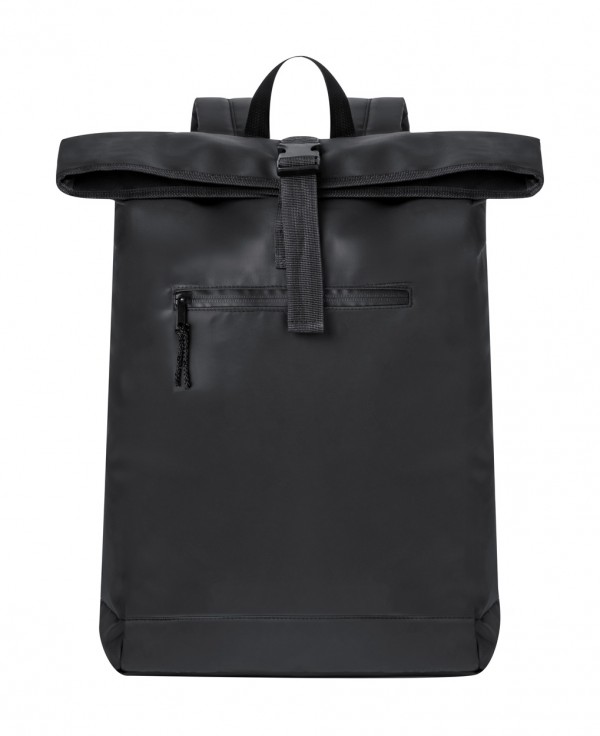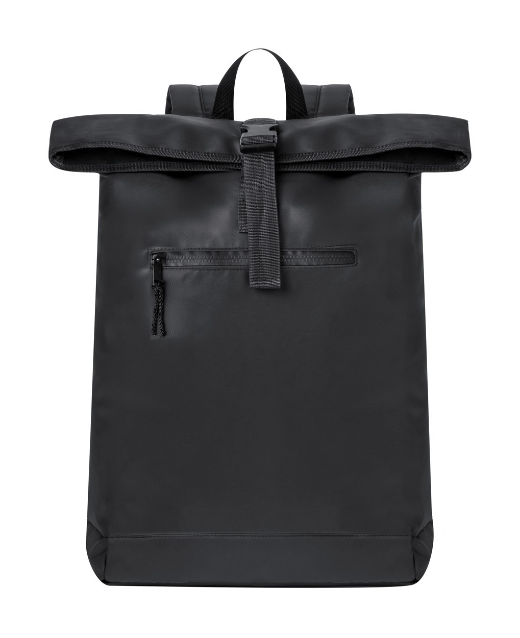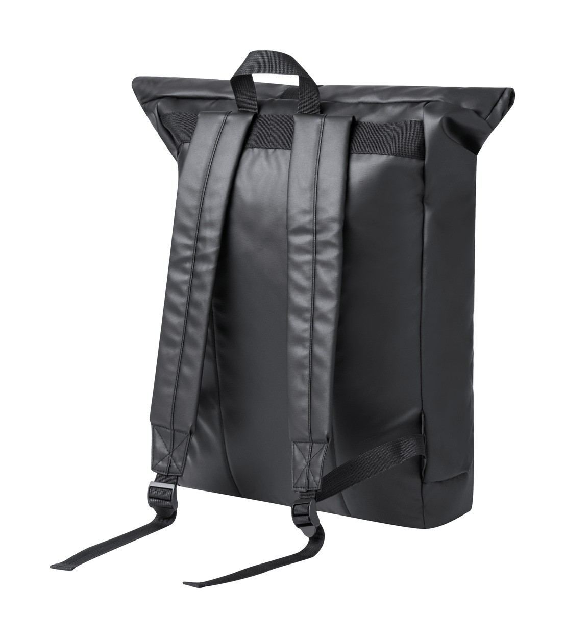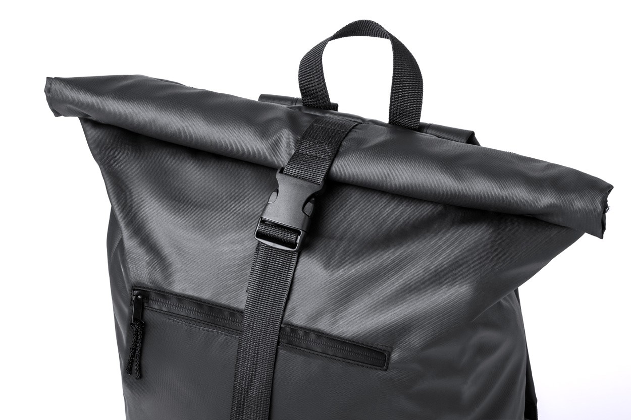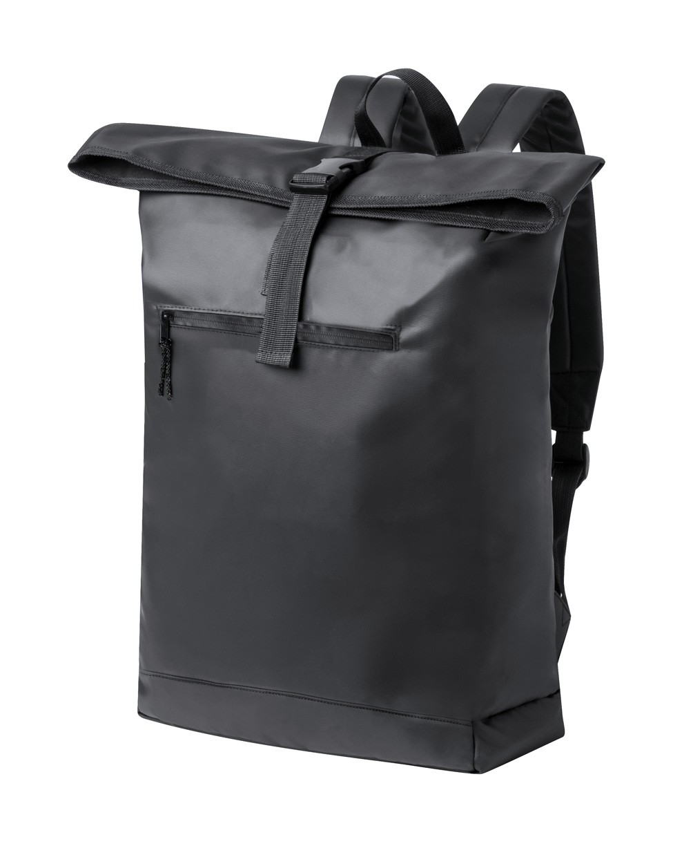 PU leather rolltop backpack with buckle closure, zipped front pocket, padded laptop (15") compartment, padded back and shoulder straps.