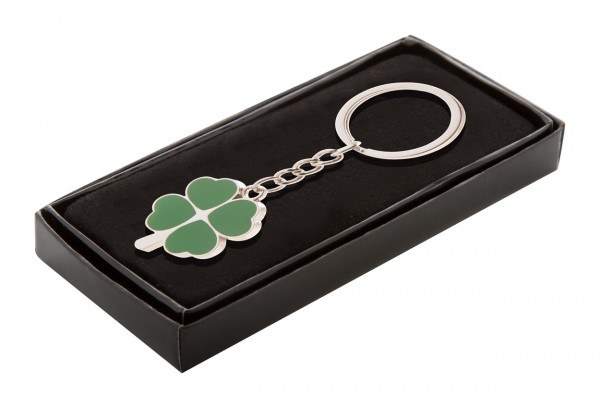 Breloc metalic în formă de trifoi cu 4 foi. În cutie neagră de cadou.