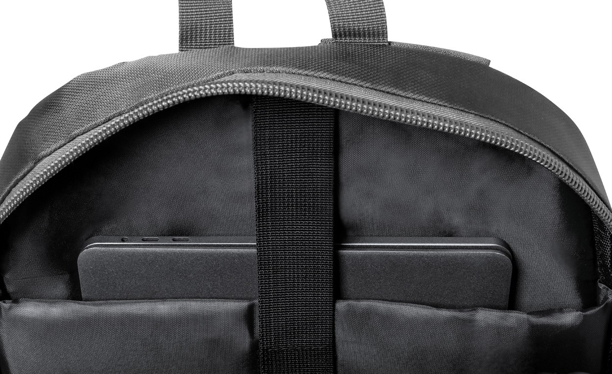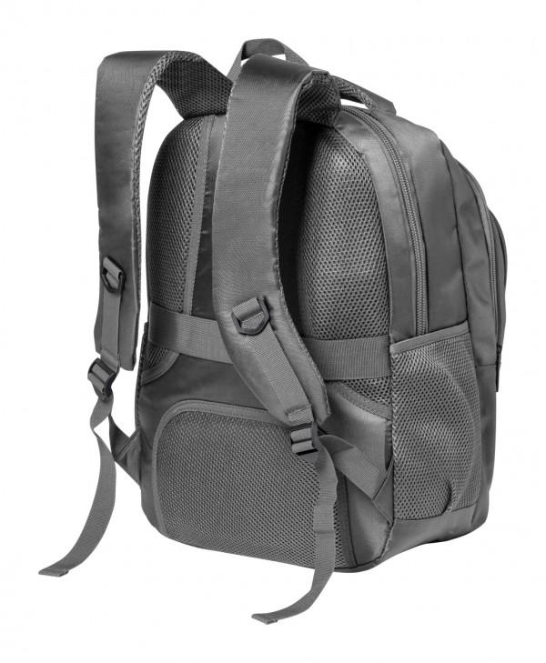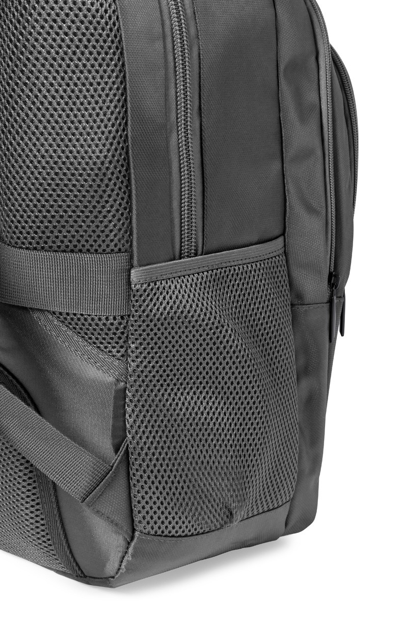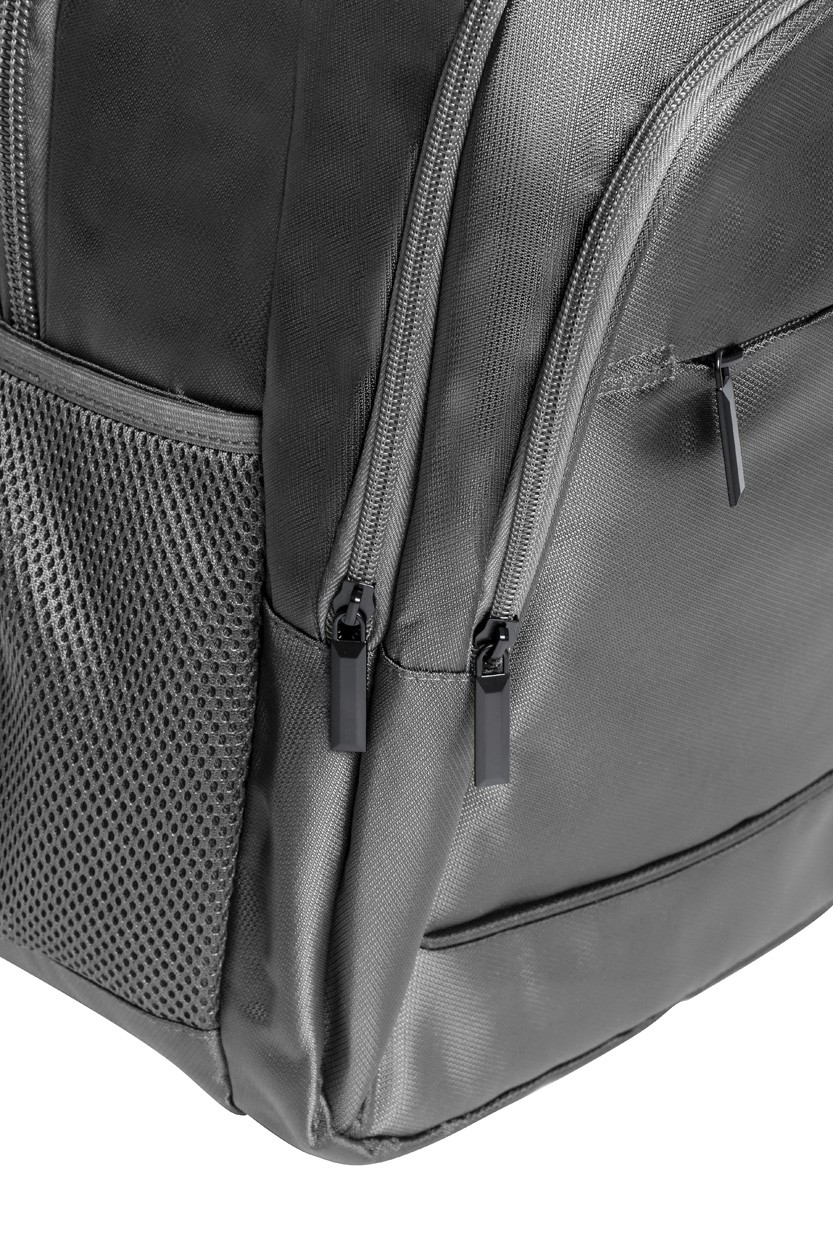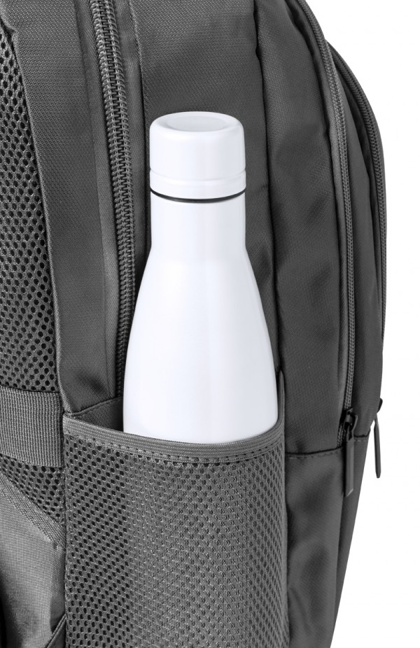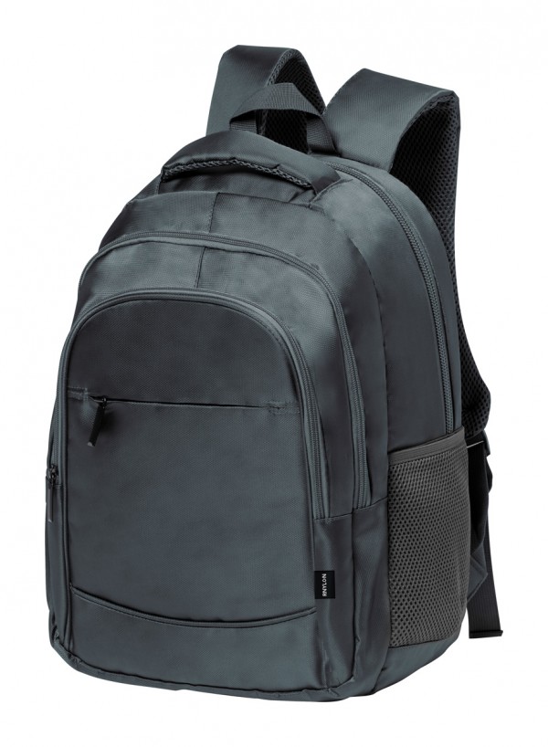 Rucsac RNYLON cu mai multe compartimente cu fermoar, buzunare laterale din plasă, buzunar căptușit pentru laptop (15"), curea pentru cărucior, spate și bretele ergonomice. Poliester 420D RNYLON cu etichetă RNYLON distinctă.