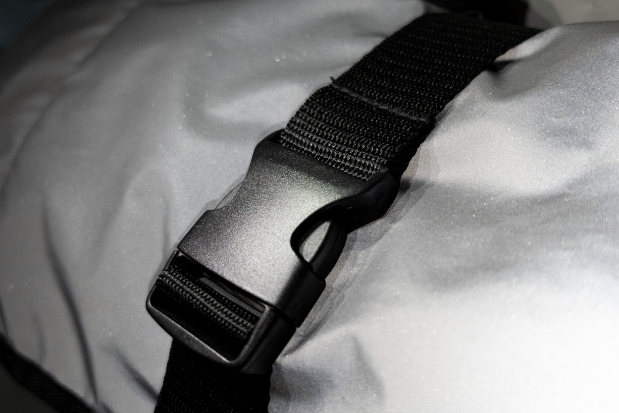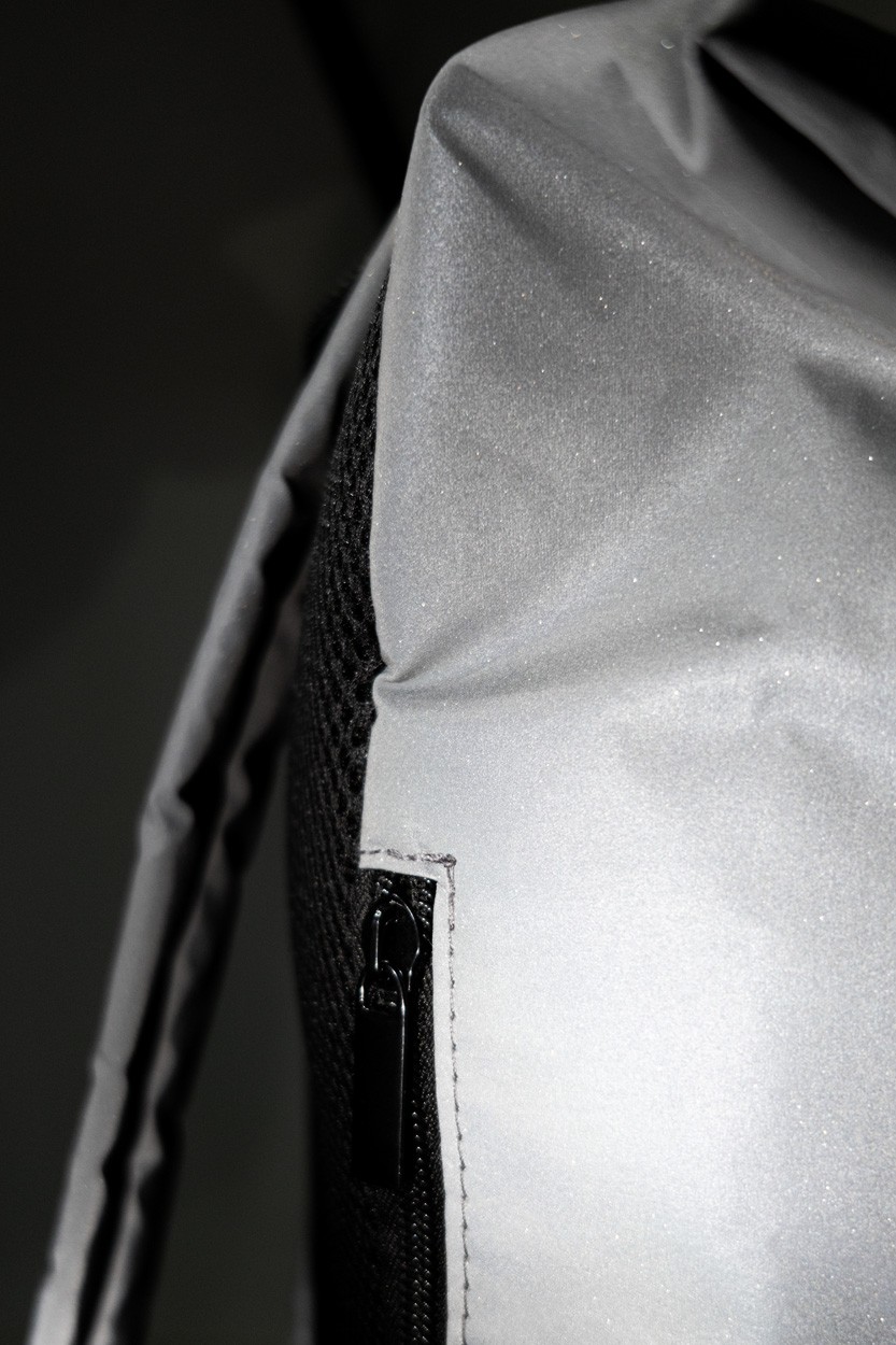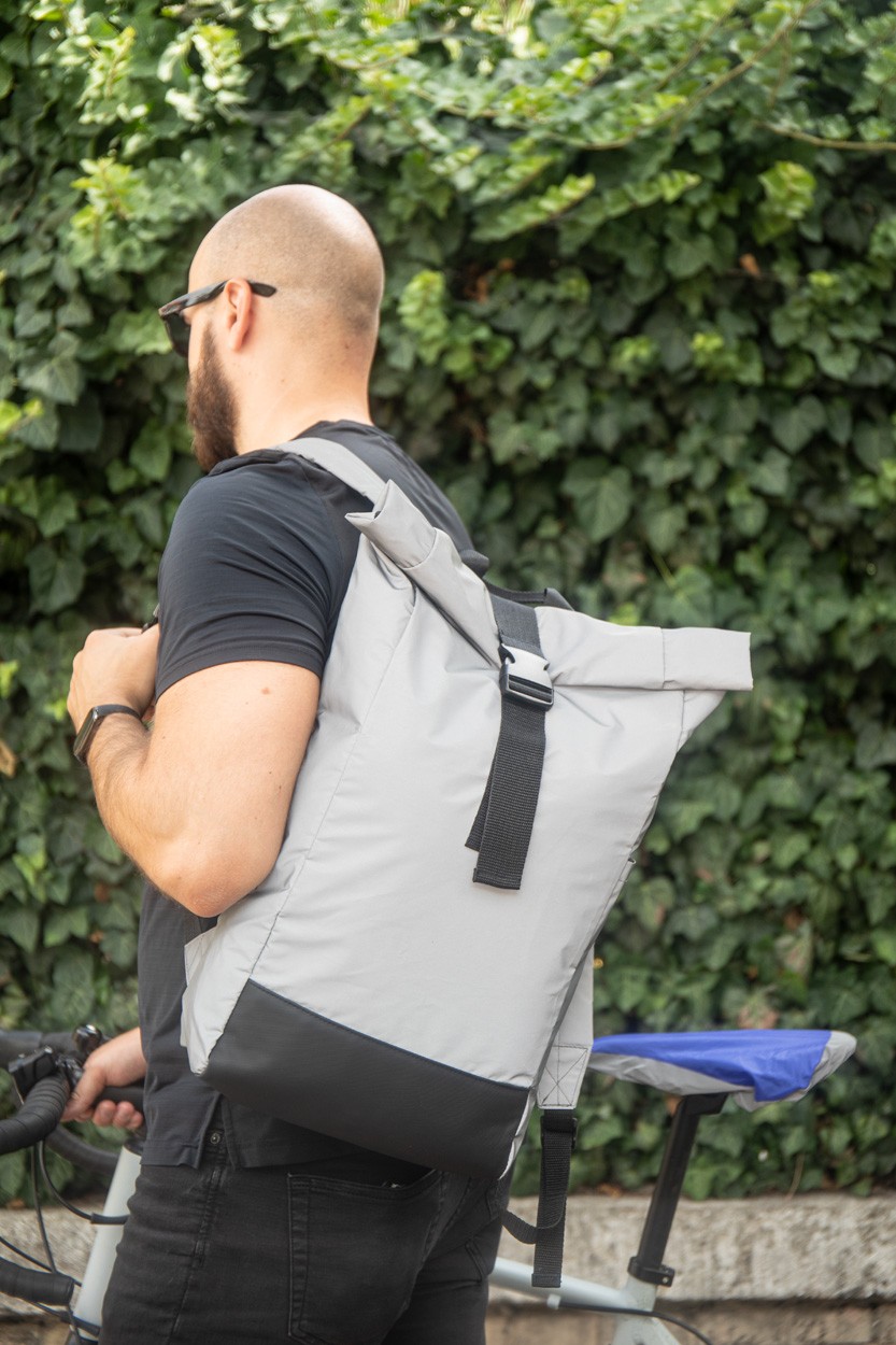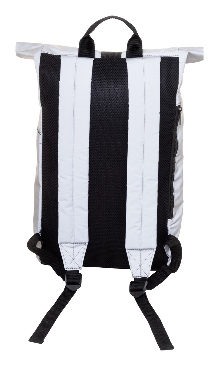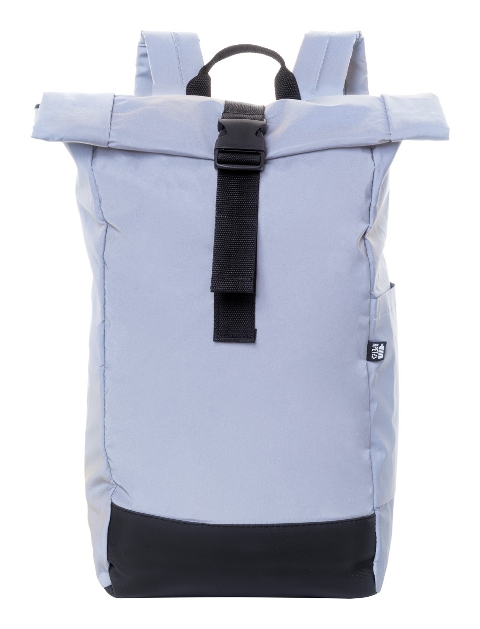 Rucsac rolltop, reflectorizant, din poliester RPET, cu compartiment principal cu inchidere cu cataramă, buzunar ascuns cu fermoar, compartiment căptușit pentru laptop (15"), buzunar lateral, spate și bretele căptușite. Cu etichetă distinctă RPET. Numai pentru uz promoțional, produsul nu se califică drept Echipament de protecție personală.