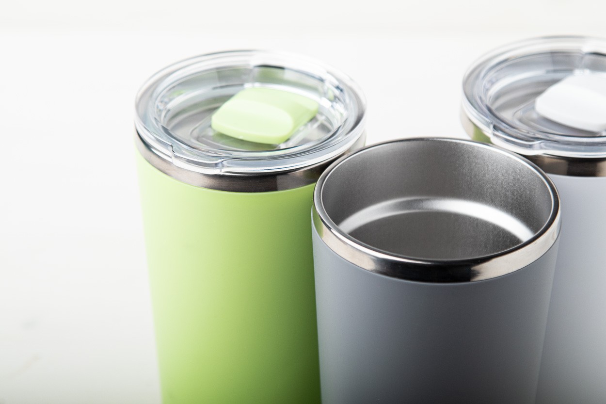 Cană termică din oțel inoxidabil, cu perete dublu acoperit cu plastic PP, cu capac de băut. 500 ml.