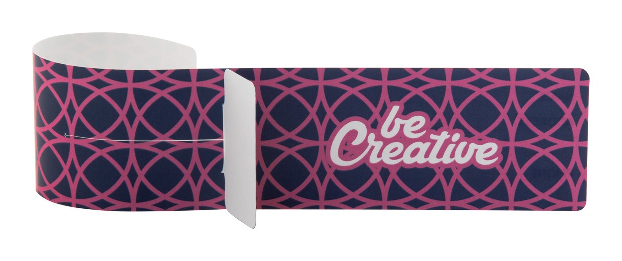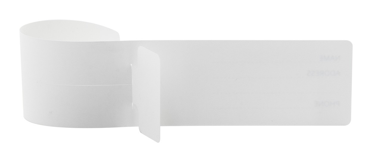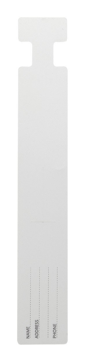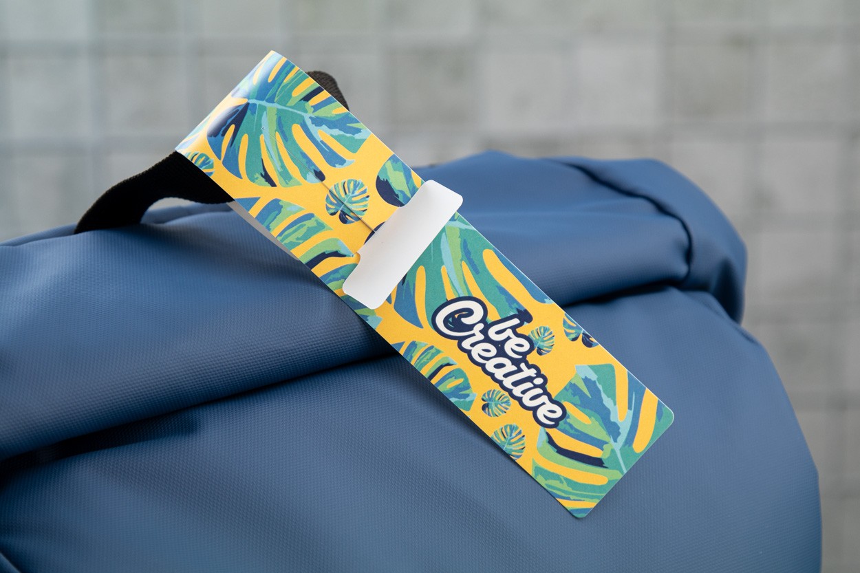 Etichetă de bagaj, din hârtie personalizată, rezistentă la apă și la rupere. Prețul include imprimarea color pe fată. MOQ: 250 buc.
