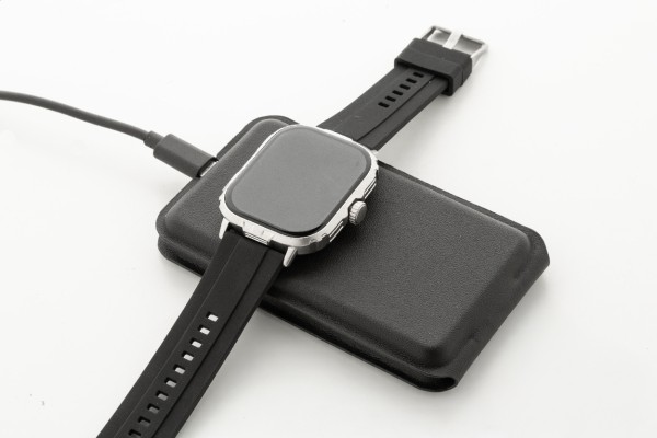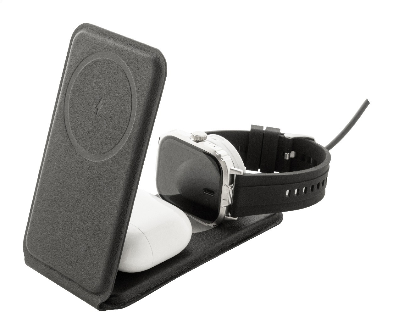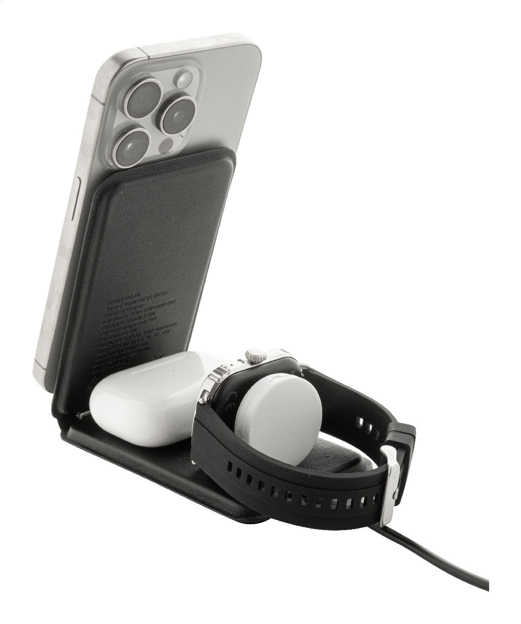 Set suport pliabil pentru telefon mobil și încărcător wireless, din piele PU reciclată. Cu încărcător rapid wireless magnetic (15W), încărcător wireless (5W) pentru căști (doar Apple®) și încărcător wireless (2,5W) pentru ceasuri inteligente (Apple® și Samsung®). Include inel metalic autoadeziv pentru a utiliza funcția magnetică pe orice dispozitiv încărcabil wireless. Compatibil cu iPhone® 12 sau modele mai noi. Include cablu de încărcare USB.