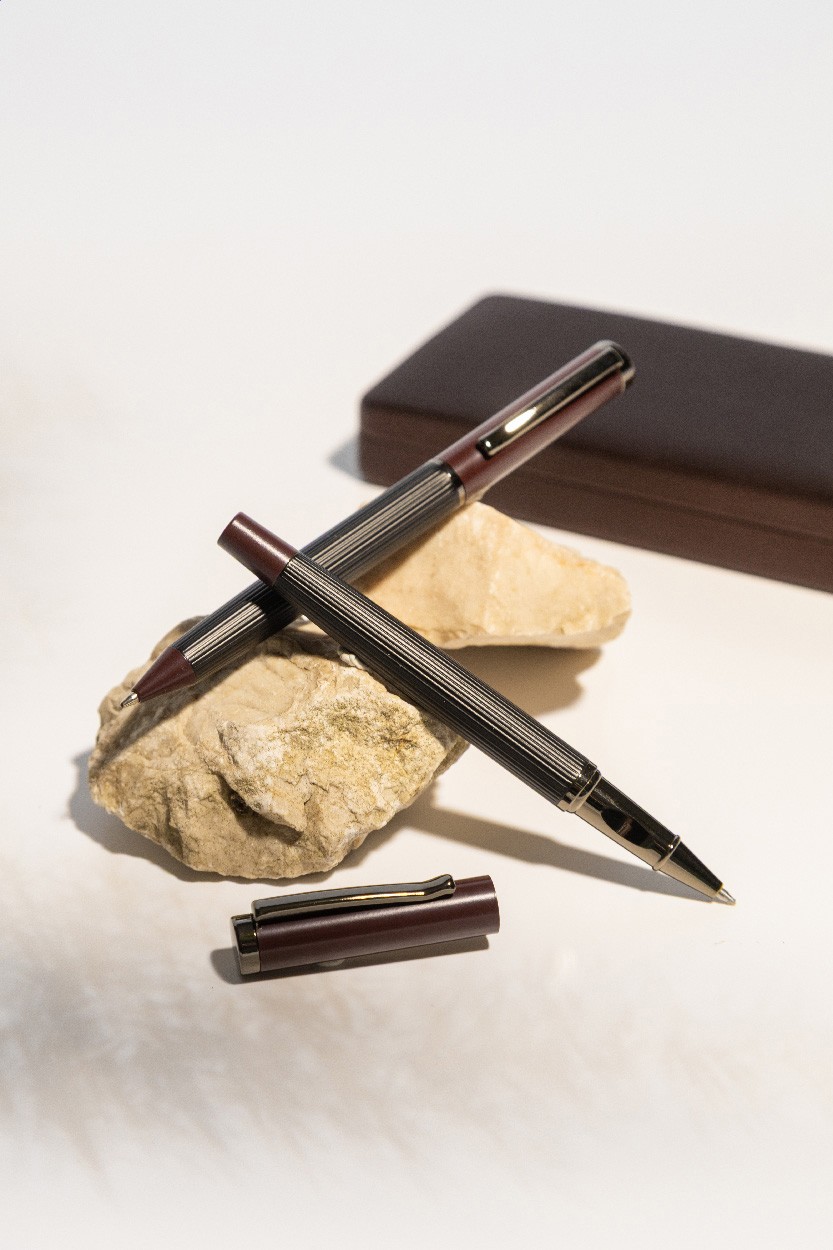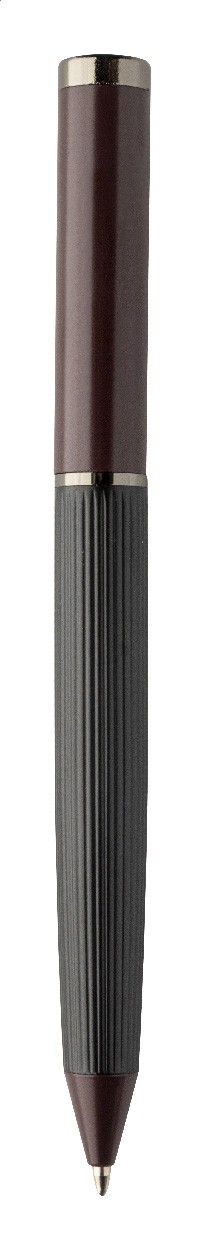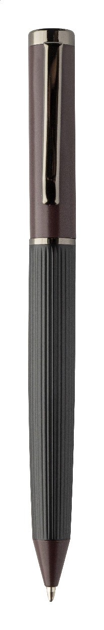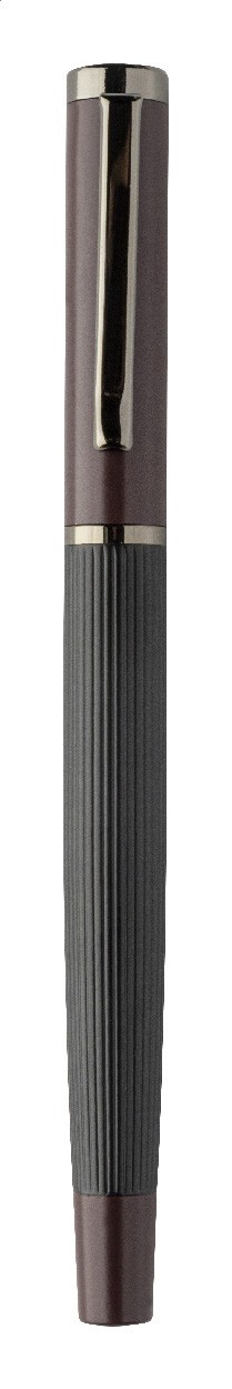 Set elegant de pix și roller, din metal, cu bară în dungi, accente colorate și detalii metalice strălucitoare. În cutie cadou de culoare asortată, cu mină albastră. Produs marca André Philippe.
