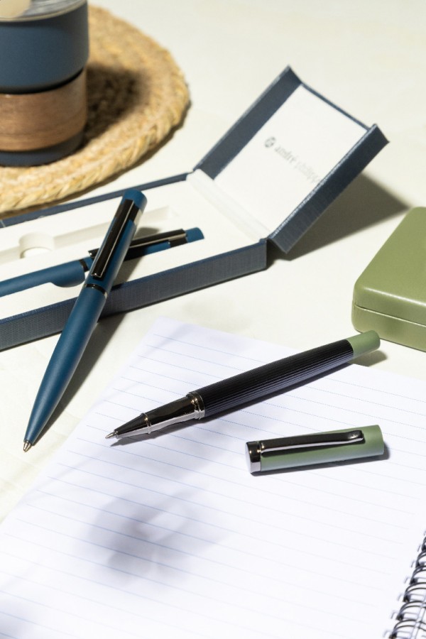 Set elegant de pix și roller, din metal, cu bară în dungi, accente colorate și detalii metalice strălucitoare. În cutie cadou de culoare asortată, cu mină albastră. Produs marca André Philippe.