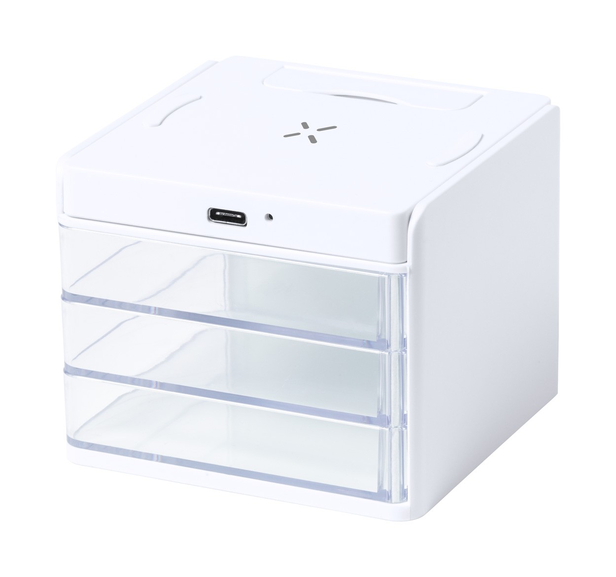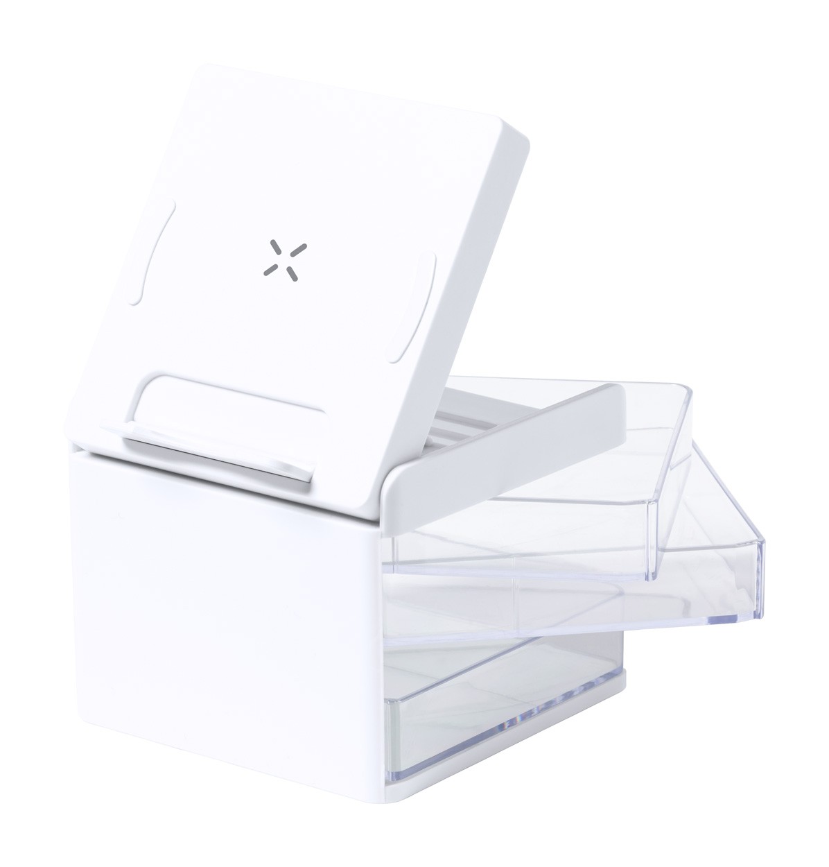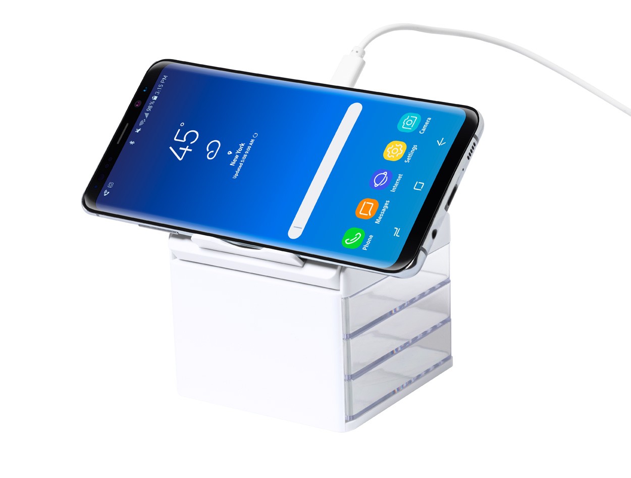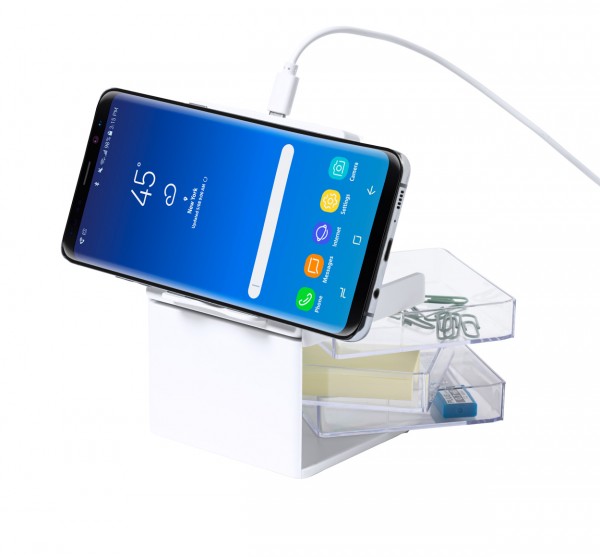 Organizator de birou cu 3 compartimente transparente de depozitare și încărcător rapid wireless încorporat (10W). Inclusiv cablu de încărcare USB.