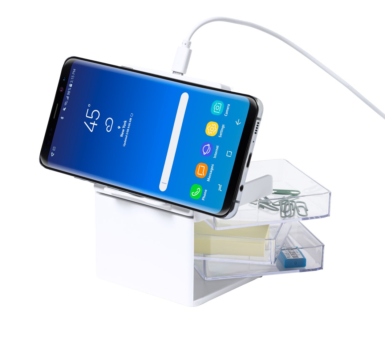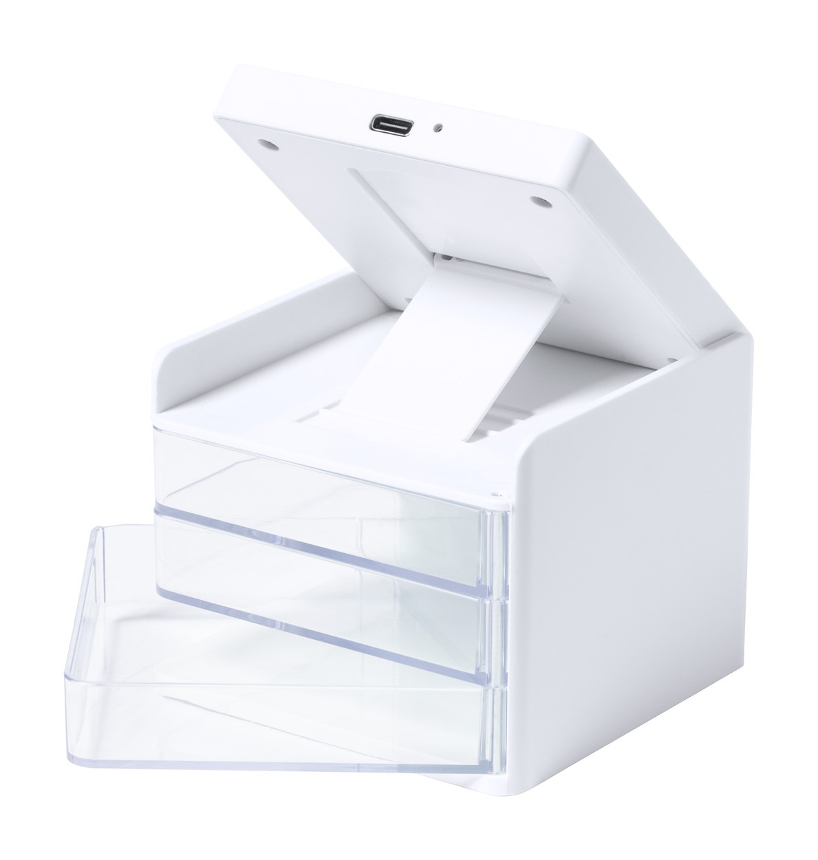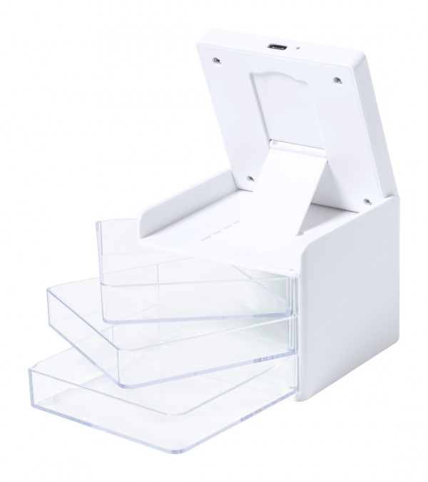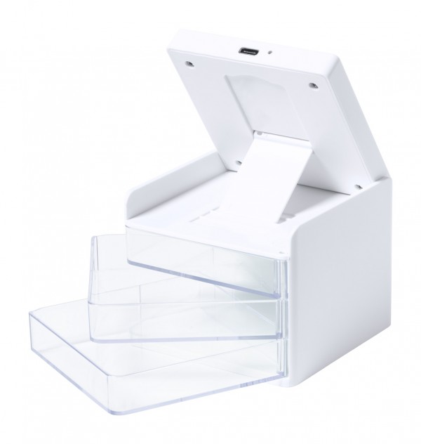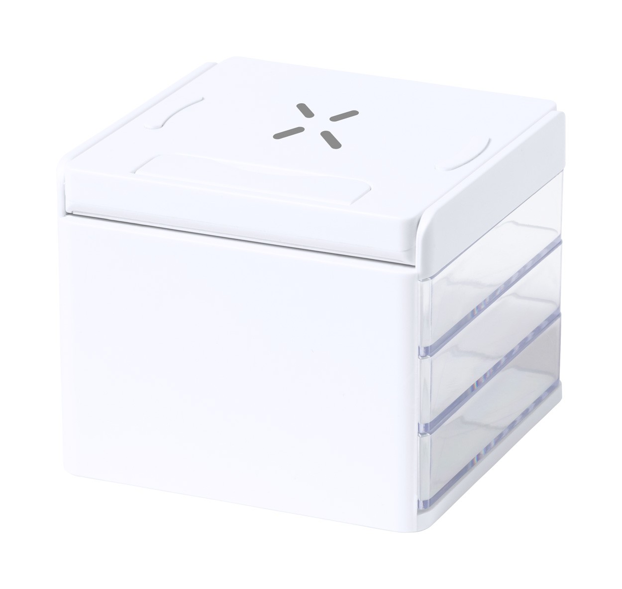 Organizator de birou cu 3 compartimente transparente de depozitare și încărcător rapid wireless încorporat (10W). Inclusiv cablu de încărcare USB.