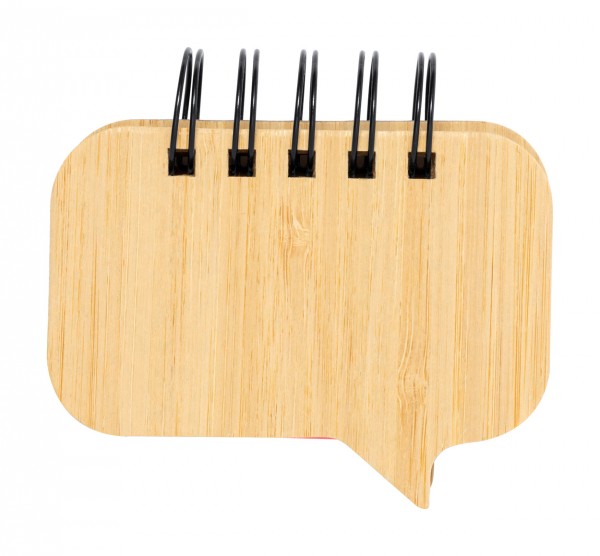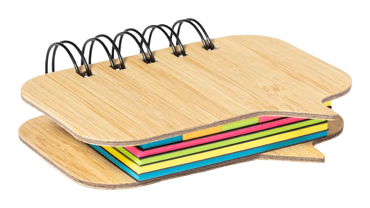 Carnețel de notițe spiralat, cu copertă din bambus, cu 100 de note adezive mari (în 4 culori diferite) și 125 de markere de pagină (în 5 culori diferite).