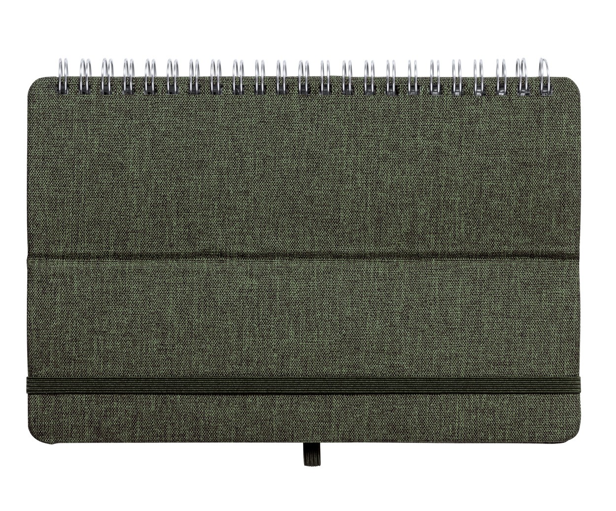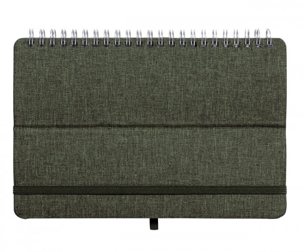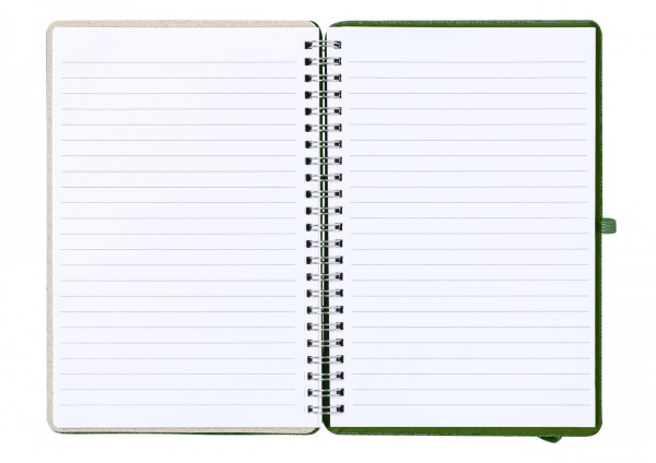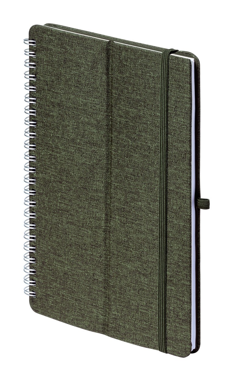 Agendă cu spirală,cu copertă din poliester 600D RPET, cu suport pentru telefon mobil din plastic din paie de grâu și inserție pentru suport de masă. Cu 70 de foi dictando și curea de cauciuc. Dimensiune A5.