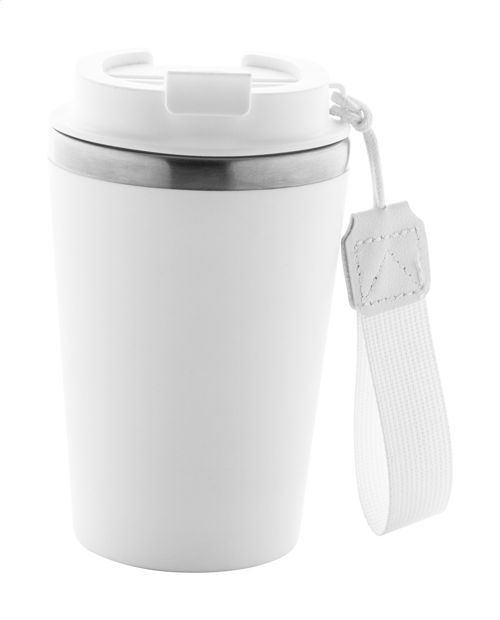 Pahar termoizolant, din oțel inoxidabil reciclat, cu perete dublu, cu exterior din plastic PP și capac pentru băutură. Cu curea de transport RPET. 350 ml.