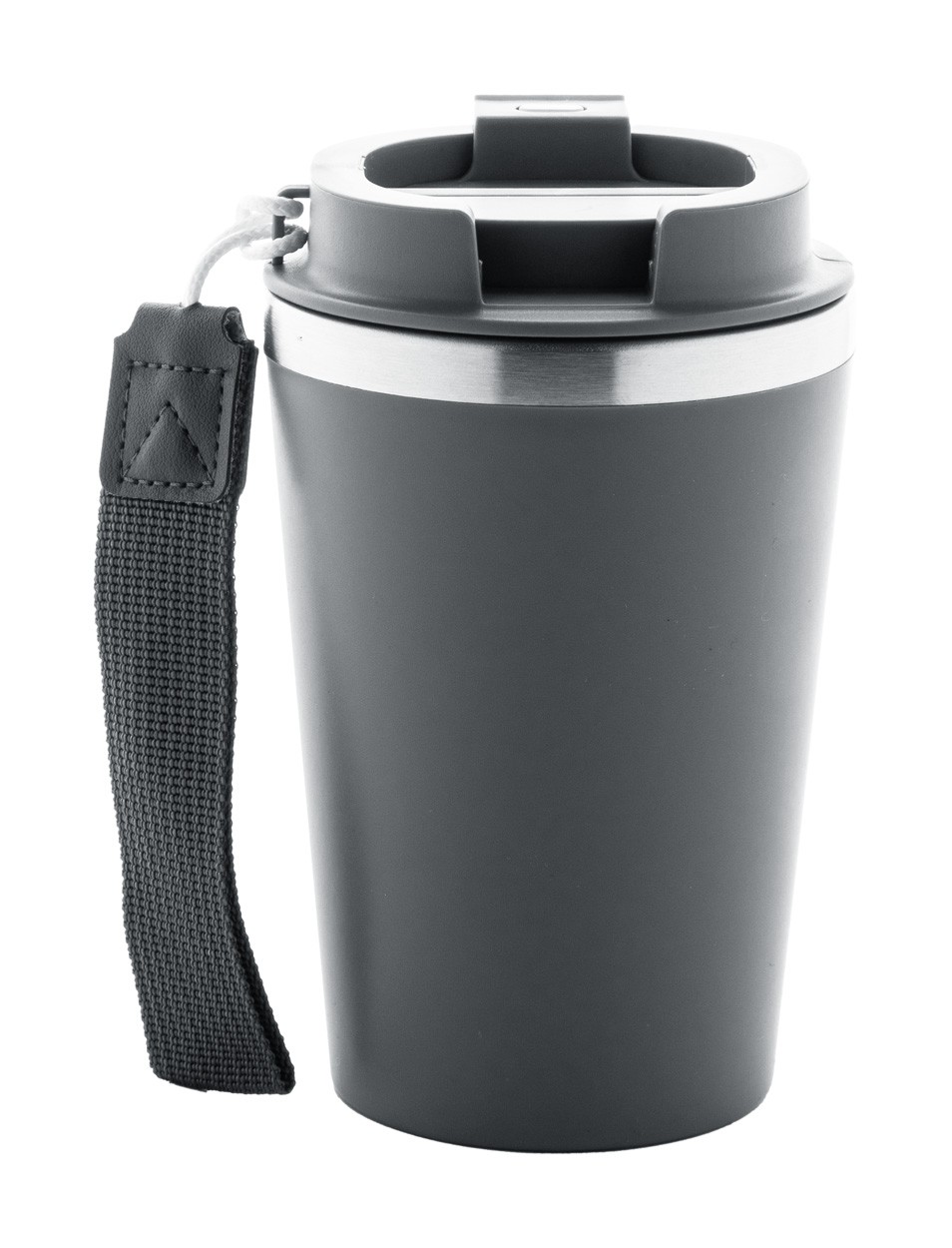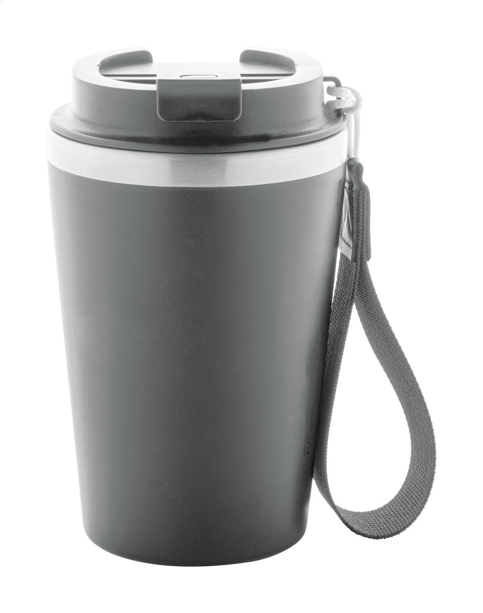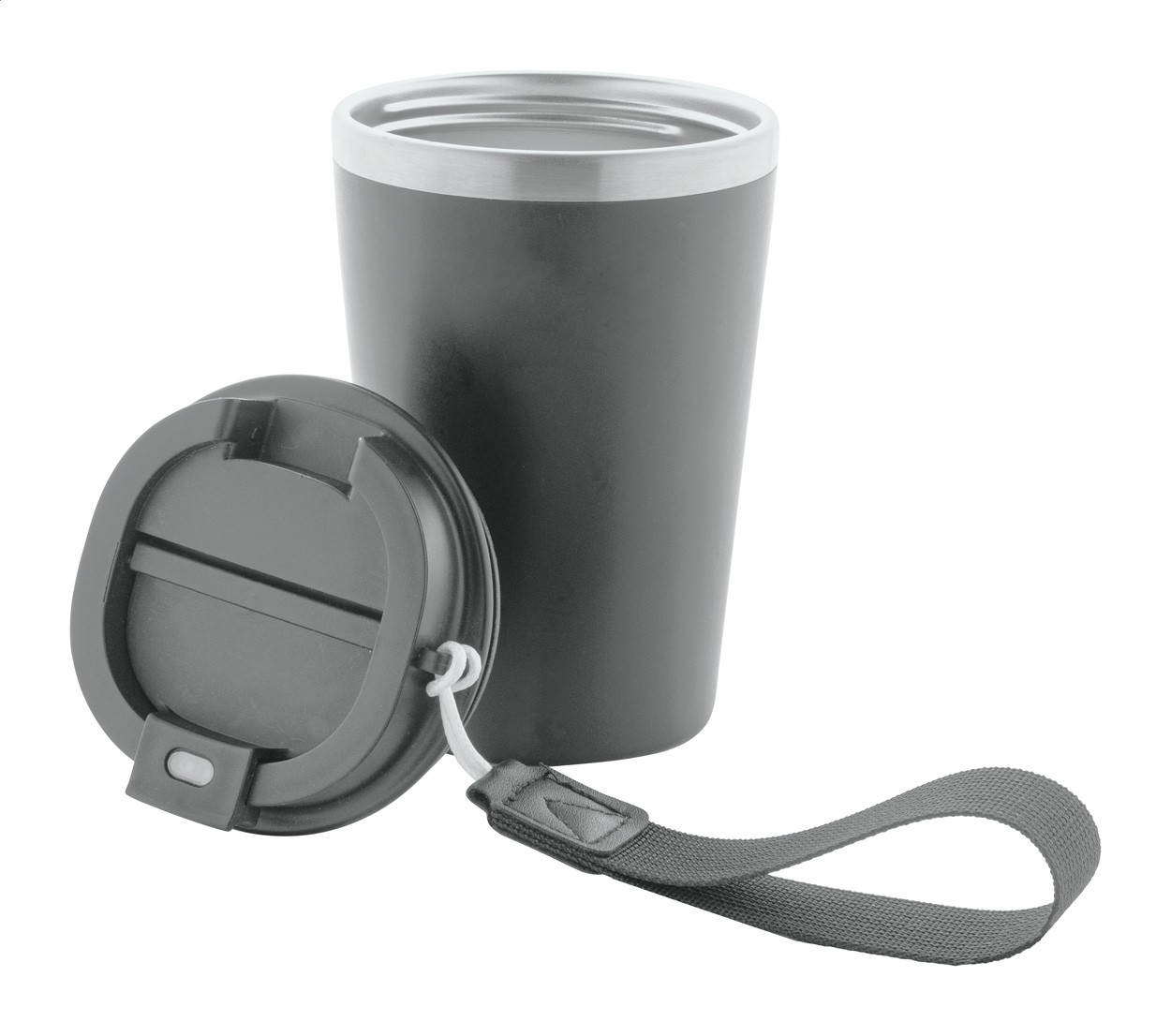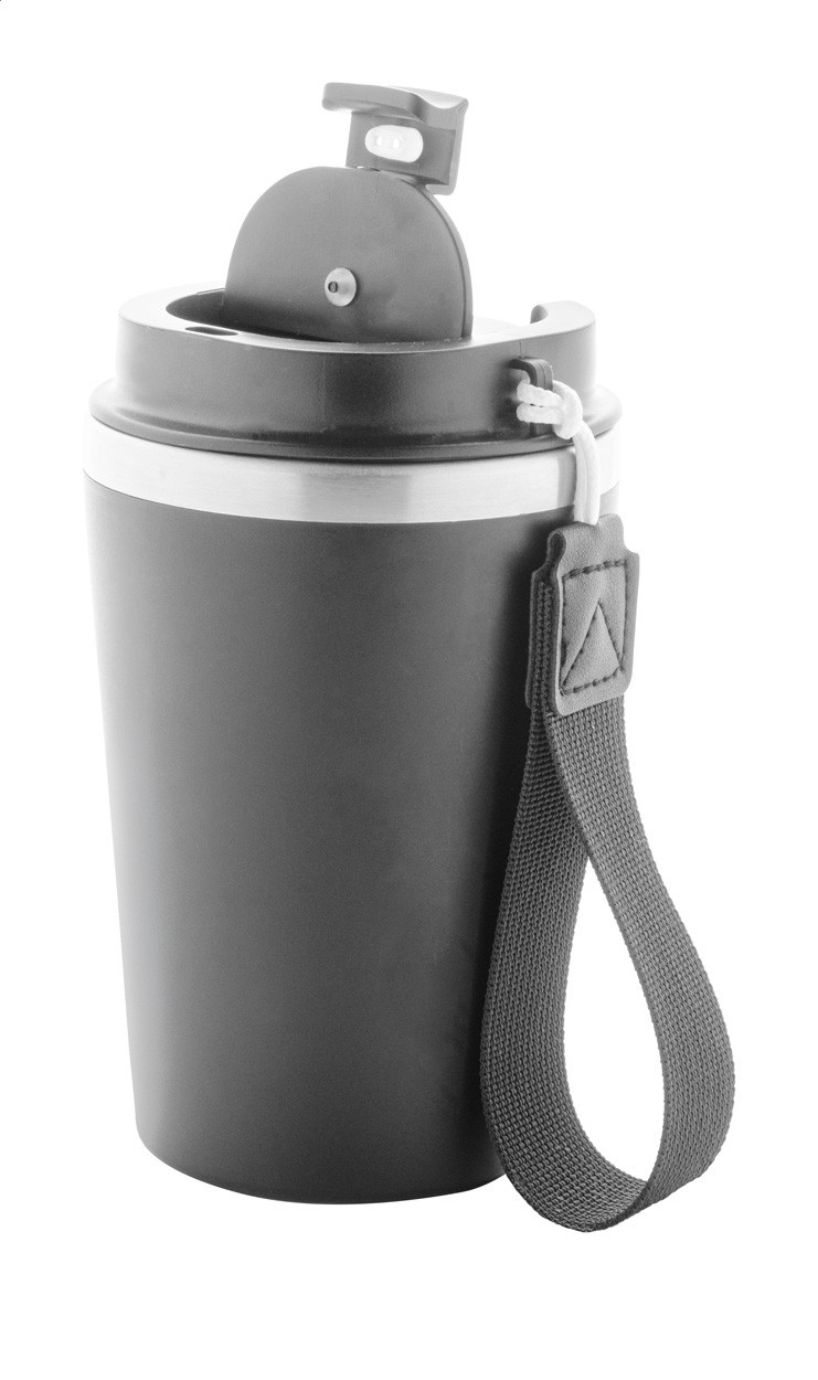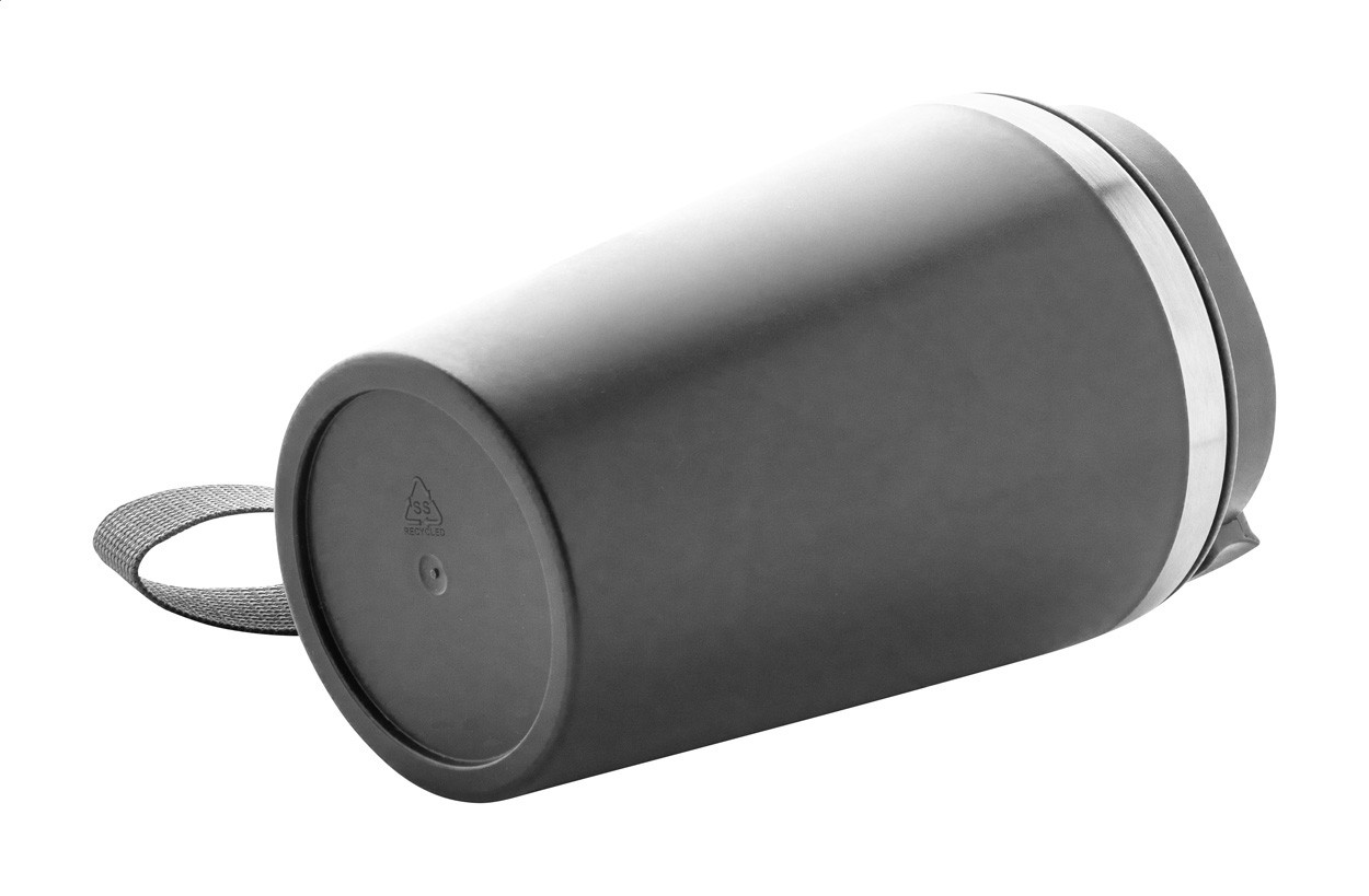 Pahar termoizolant, din oțel inoxidabil reciclat, cu perete dublu, cu exterior din plastic PP și capac pentru băutură. Cu curea de transport RPET. 350 ml.