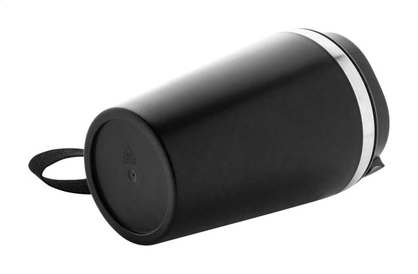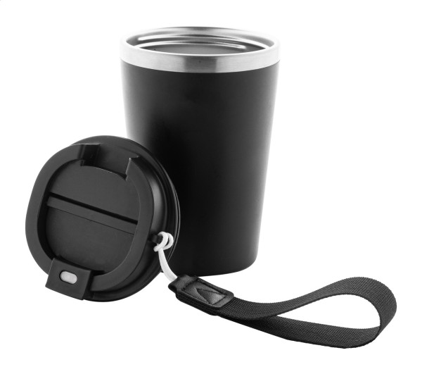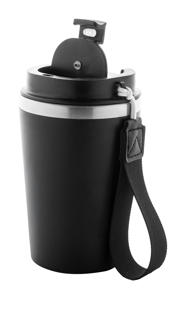 Pahar termoizolant, din oțel inoxidabil reciclat, cu perete dublu, cu exterior din plastic PP și capac pentru băutură. Cu curea de transport RPET. 350 ml.