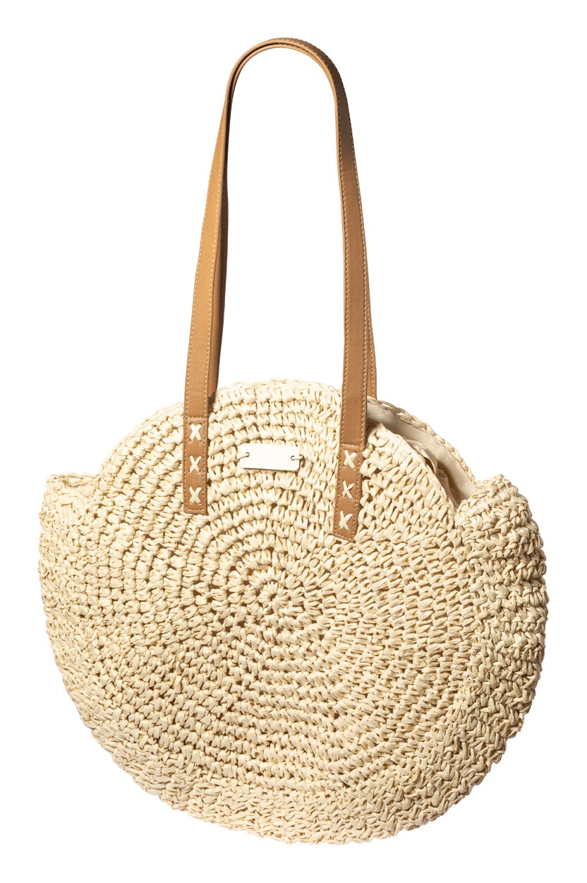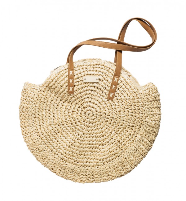 Geantă de plajă din rafie sintetică, de formă rotundă, cu fermoar, cu mânere din piele PU.