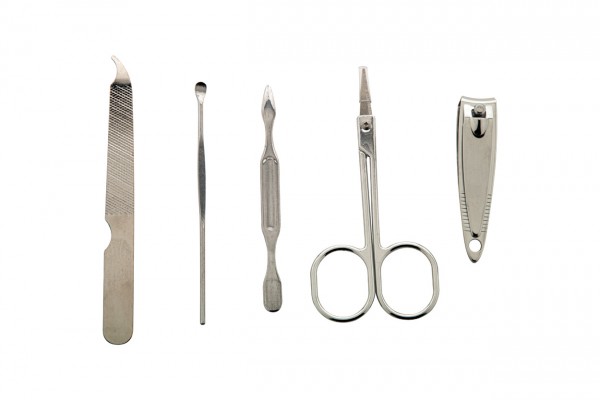 Set manichiură, 5 buc, din oțel inoxidabil, în cutie de bambus cu capac magnetic. Include foarfece, unghieră, pilă de unghii și 2 dispozitive de îndepărtare a cuticulelor.