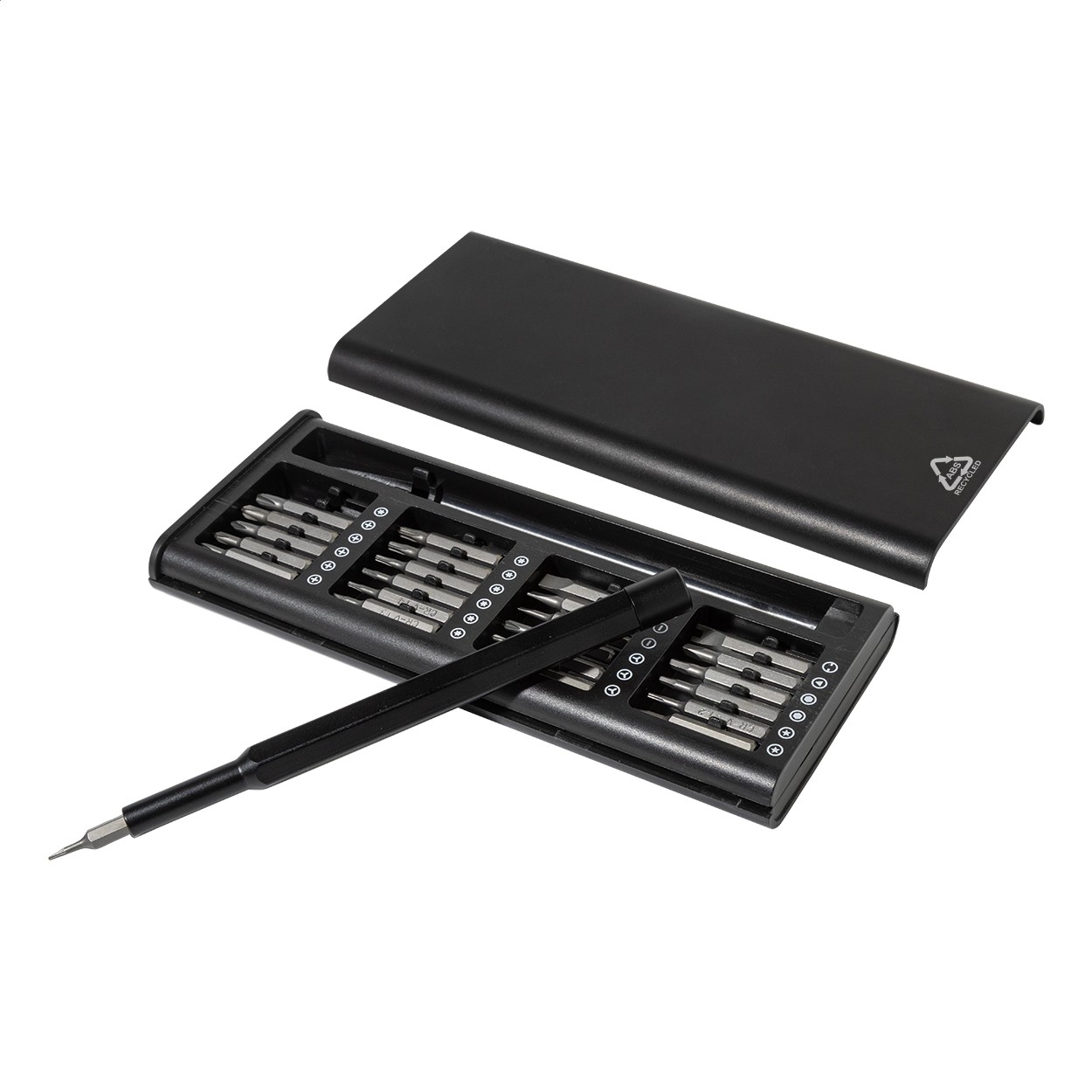 Set de șurubelnițe de precizie, cu 24 de biți, în cutie din ABS reciclat. Mânerul șurubelniței este prevăzut cu un sistem magnetic de fixare a biților, pentru schimbarea rapidă și sigură a acestora.