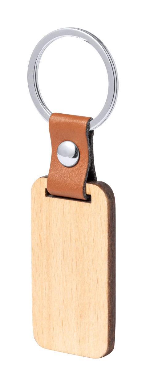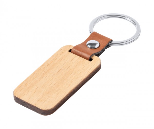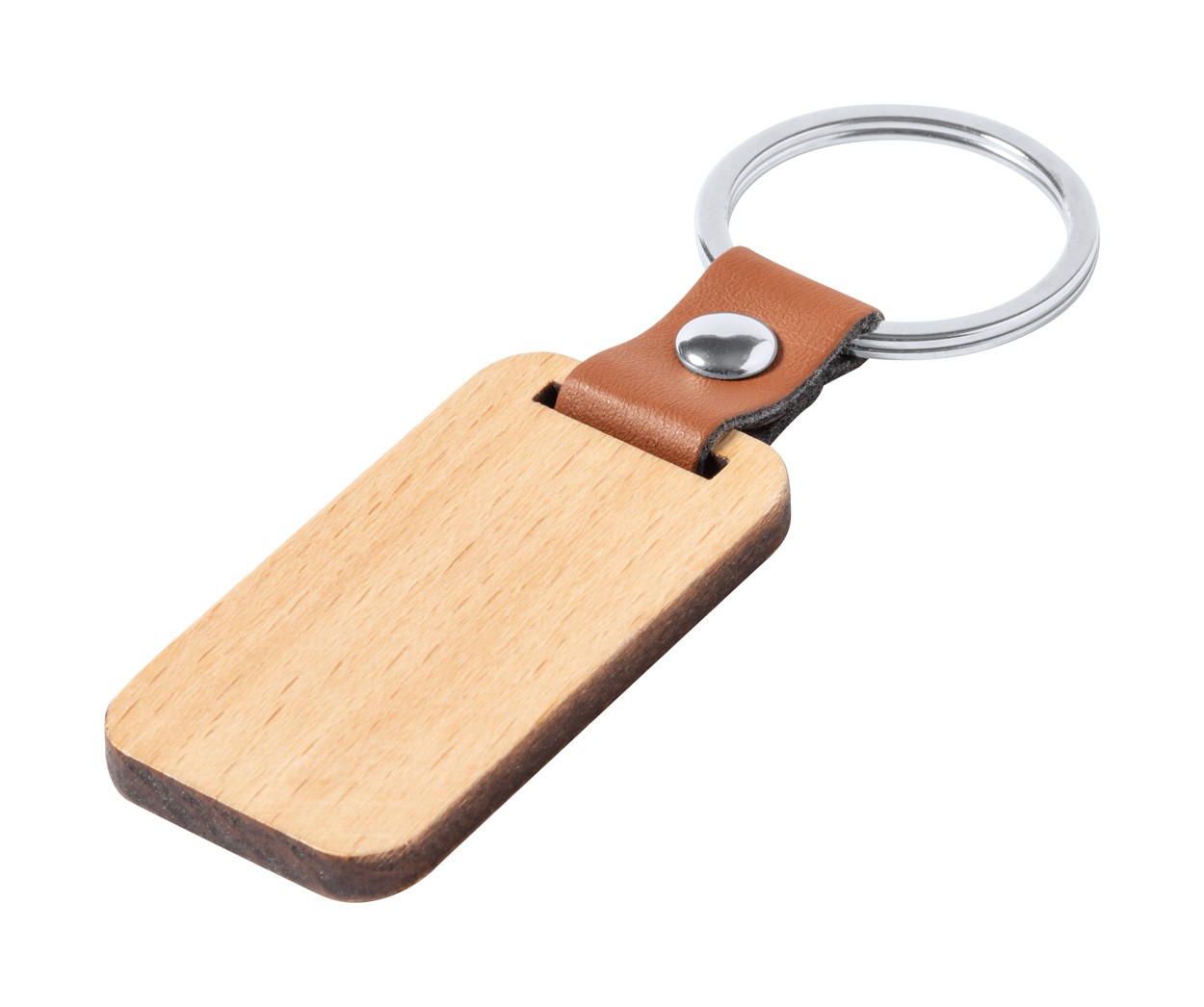 Breloc din lemn, cu curea din piele PU și inel metalic.