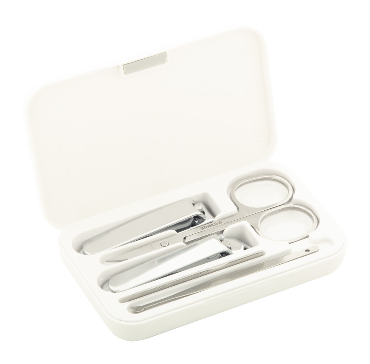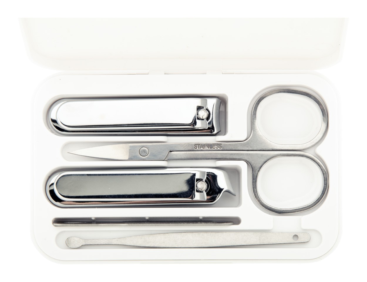 Set de manichiură din 5 buc, din oțel inoxidabil, în carcasă din plastic ABS reciclat. Include foarfece, unghieră, pilă de unghii și dispozitiv pentru îndepărtarea cuticulelor.