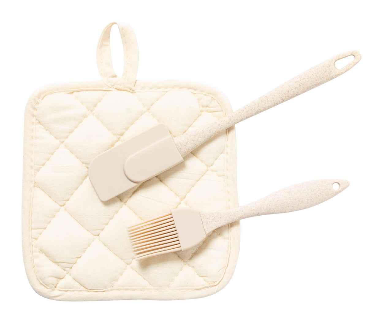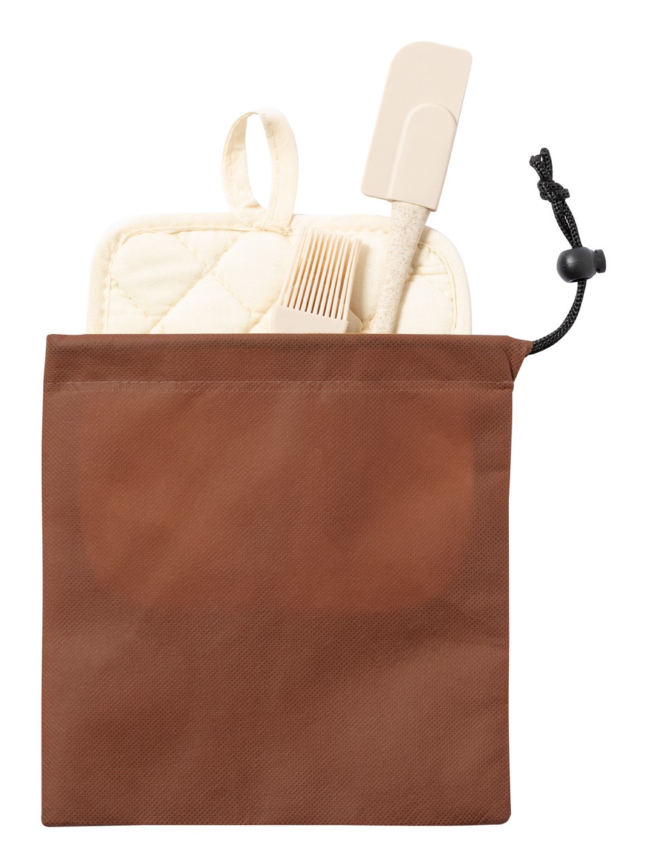 Set de bucătărie, din 3 bucăți, în husă cu șnur nețesut. Include spatulă din silicon și perie cu mânere din plastic PP și mănușă de cuptor din bumbac.