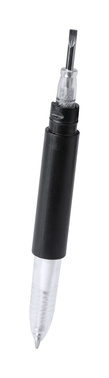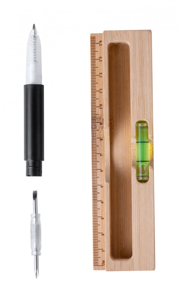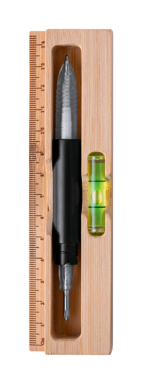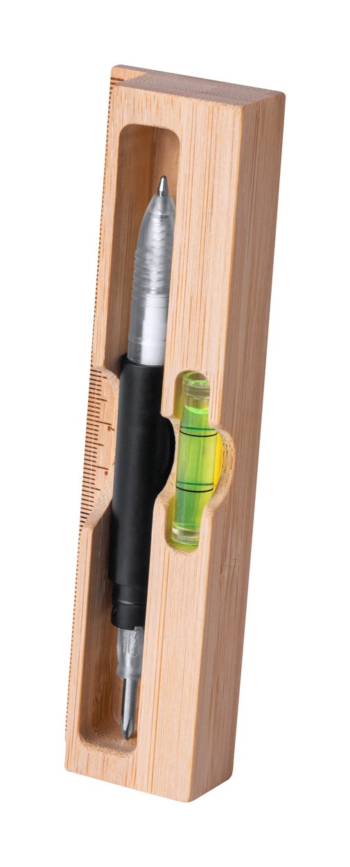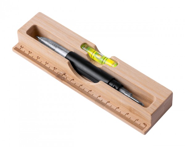 Pix multifuncțional din oțel carbon cu 5 funcții, în carcasă din bambus cu nivelă si riglă. Cu mină albastră.