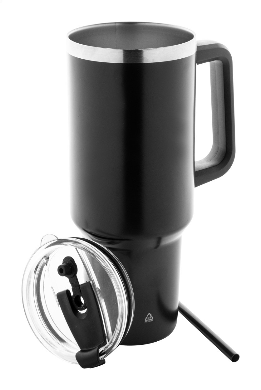 Cană termoizolată, din oțel inoxidabil reciclat, cu perete dublu, cu capac de băut PS și pai din PP. 1200 ml.