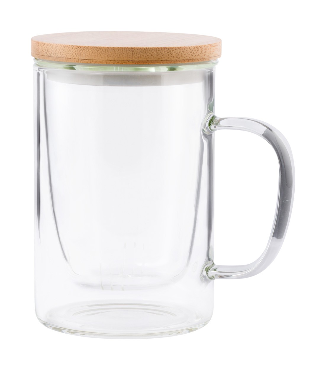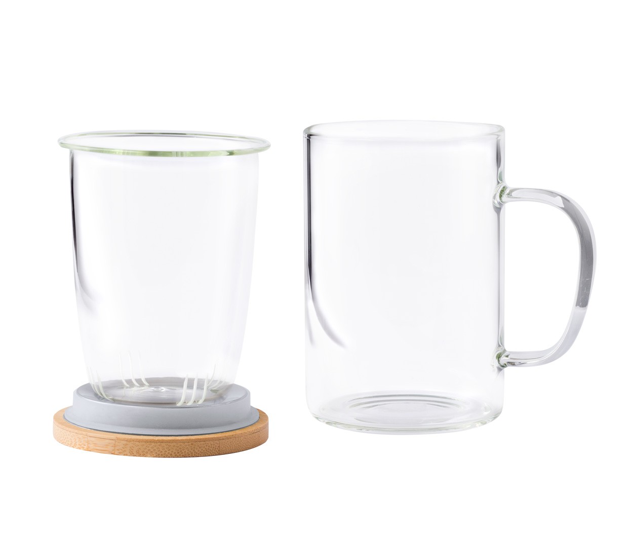 Cană din sticlă borosilicată, cu insert infuzor de ceai si capac din bambus, 450 ml. În cutie de hârtie kraft.