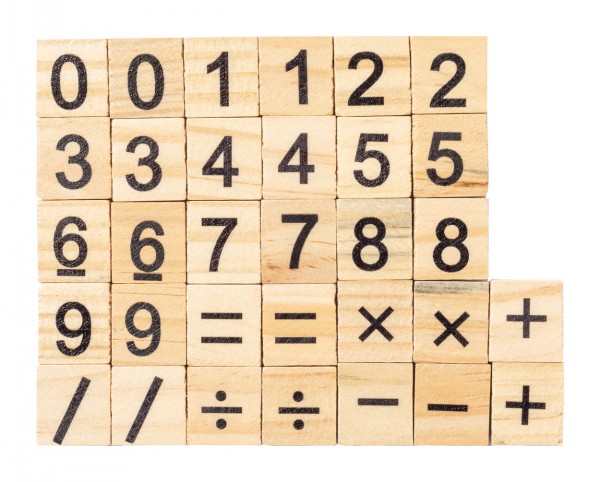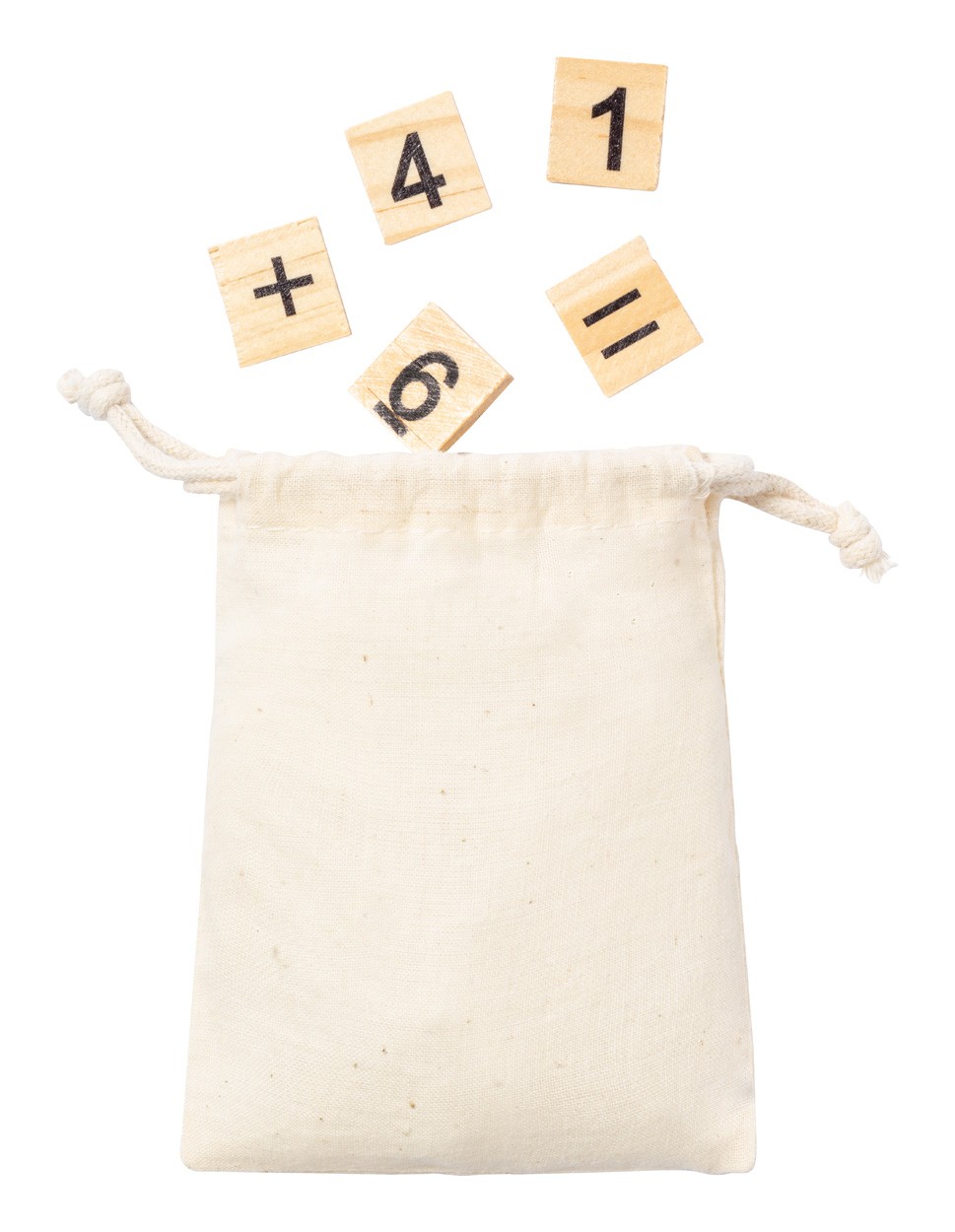 Joc educativ de numărat, din lemn, în husă de bumbac cu șnur. Cu 32 de plăci, inclusiv numere și semne de operație matematică.