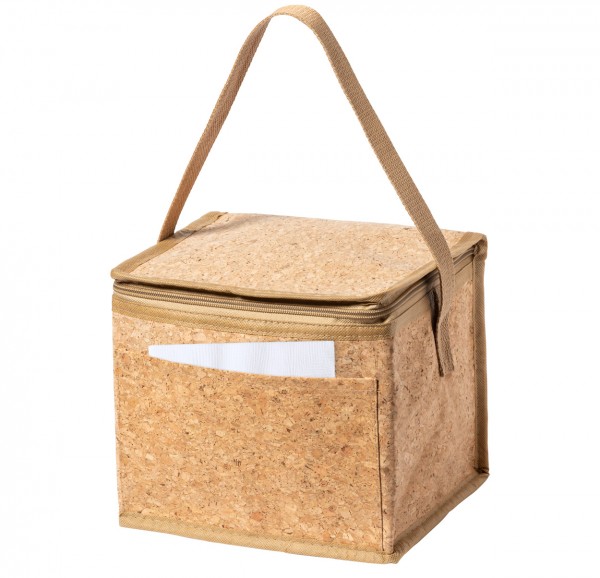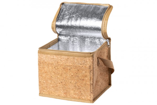 Geantă frigorifică din plută naturală, ideală pentru 6 cutii de 0,33 l cu închidere cu fermoar, căptuseală din aluminiu, mâner și buzunar frontal.