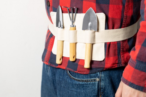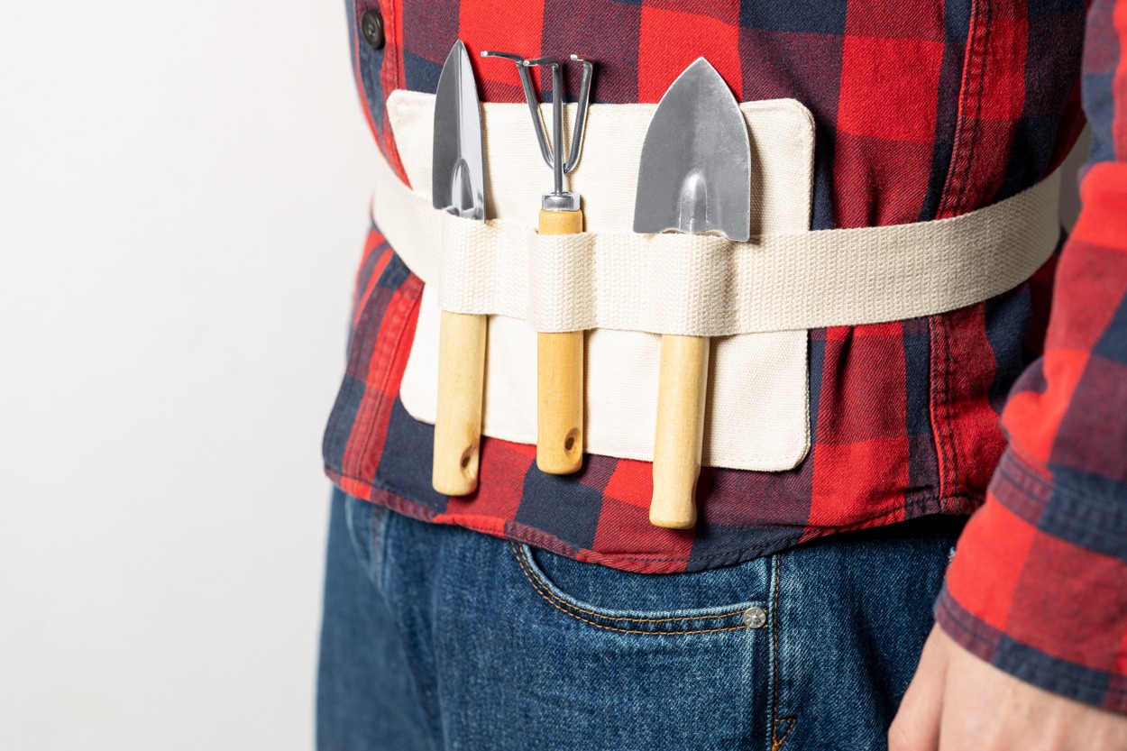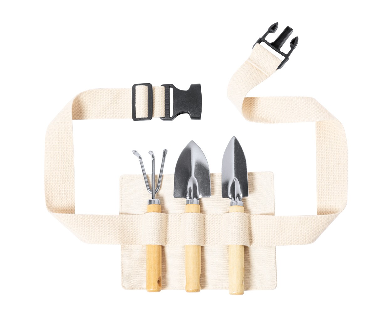 Set unelte de grădină în husă de transport din bumbac cu bandă reglabilă în talie. Inclusiv furcă de mână și 2 mistrii.