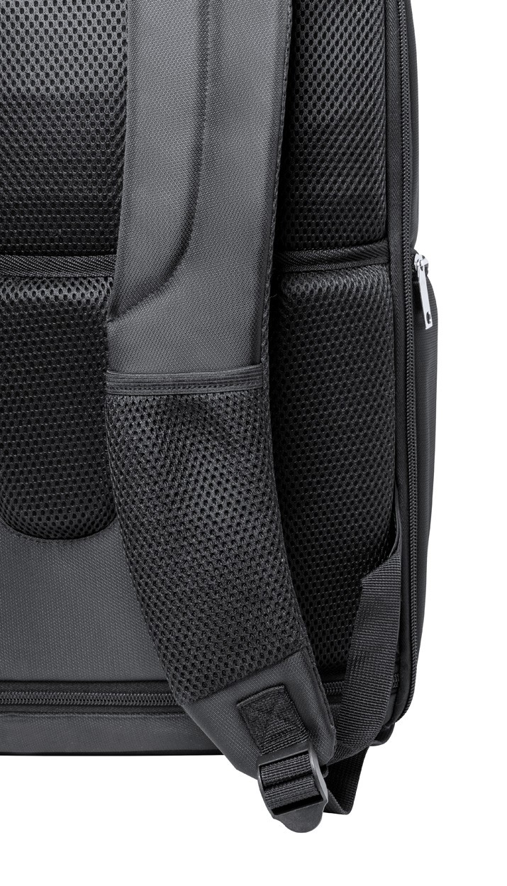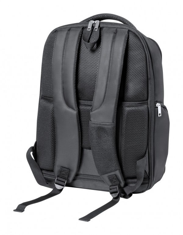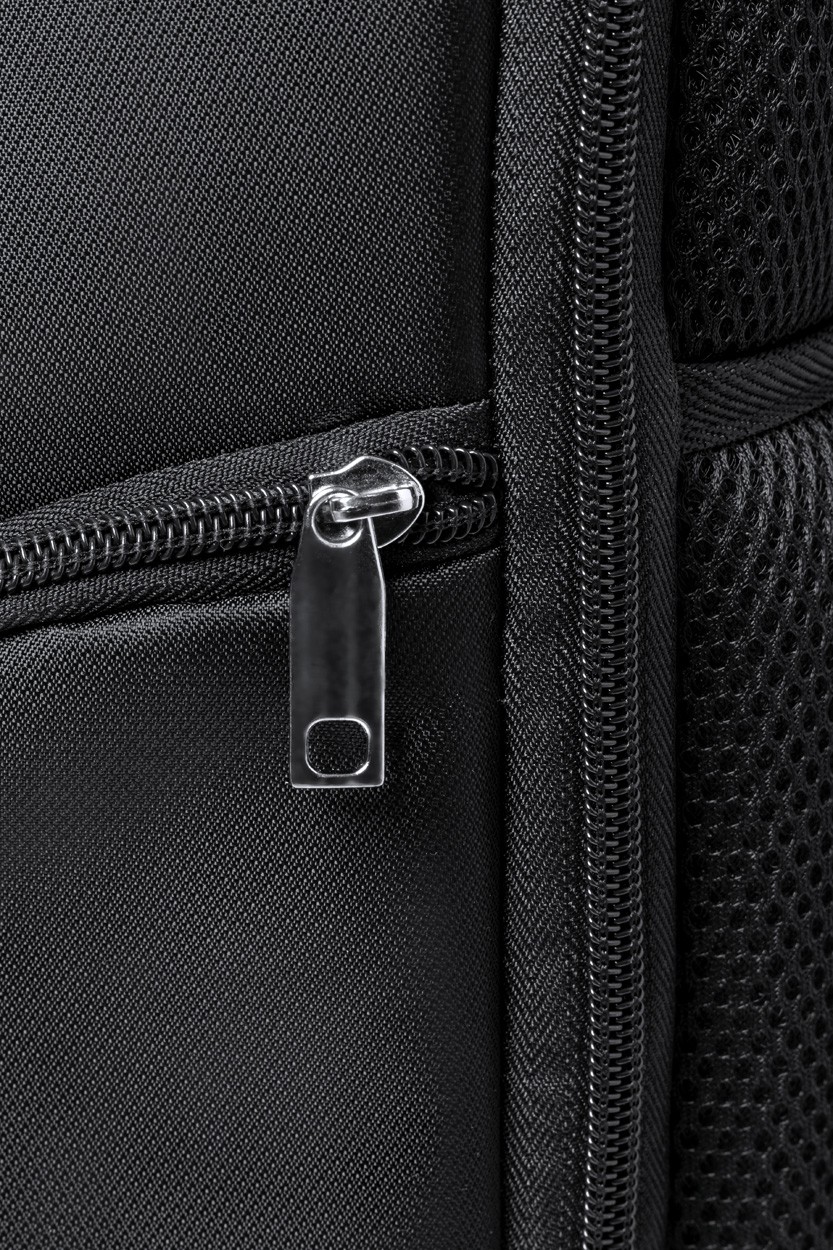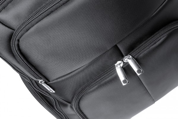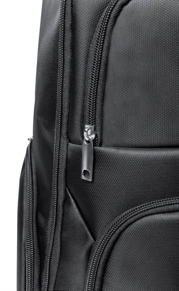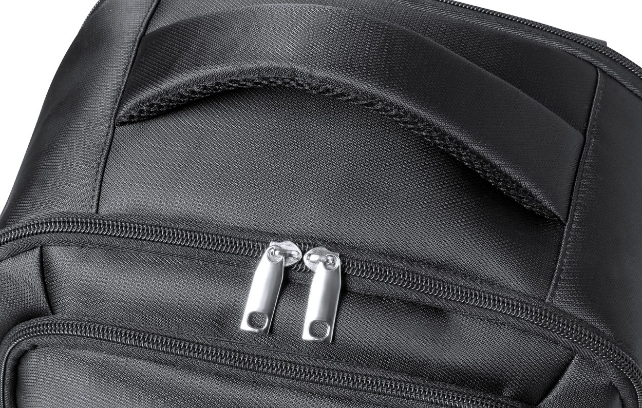 Rucsac din nailon, cu compartimente și buzunare cu fermoar, spate căptușit și bretele de umăr. Cu compartiment capitonat pentru laptop (17") și tabletă (12"). nailon 600D.