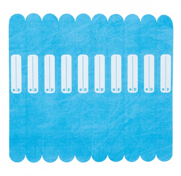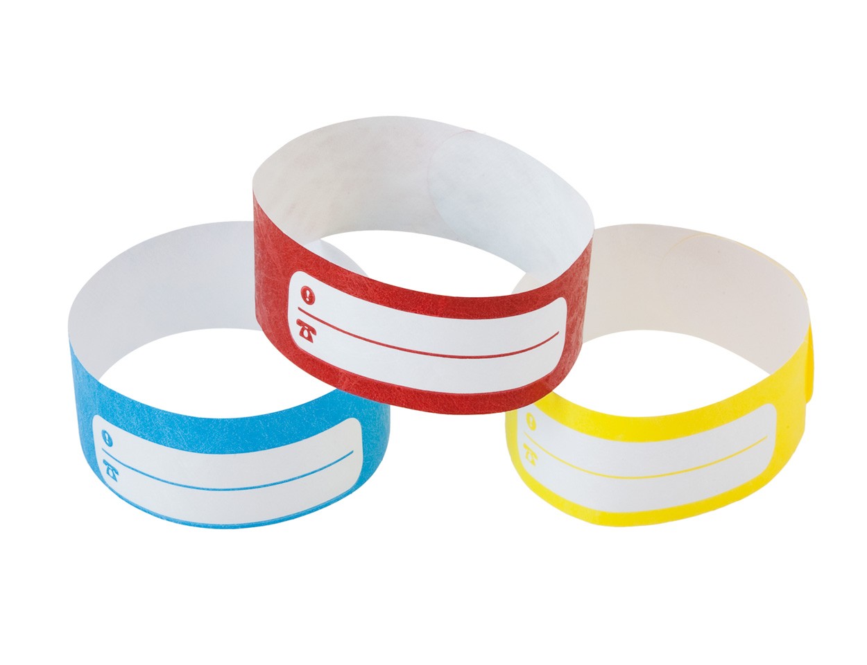 Brățară pentru copii din fibră sintetică impermeabilă cu etichetă de identificare și închidere adezivă.
