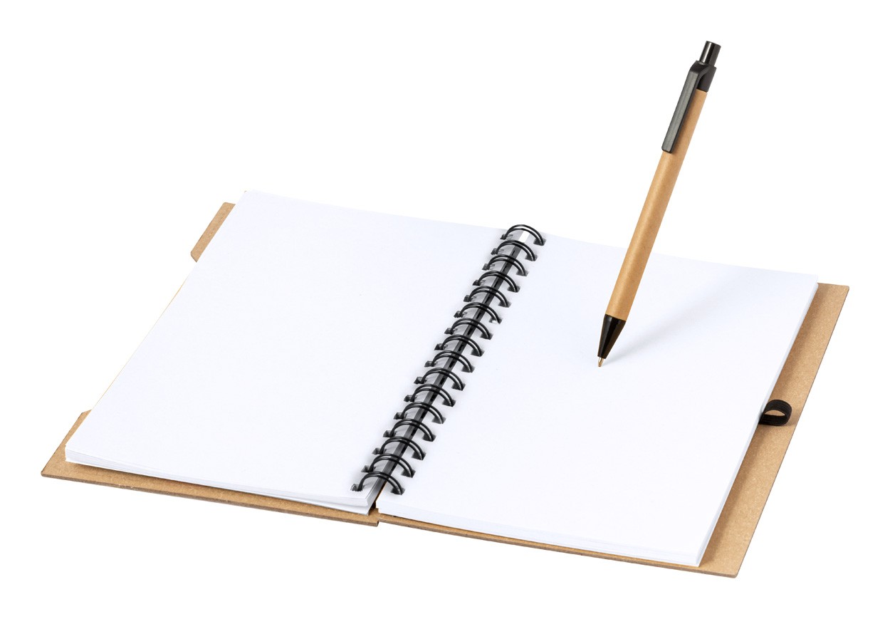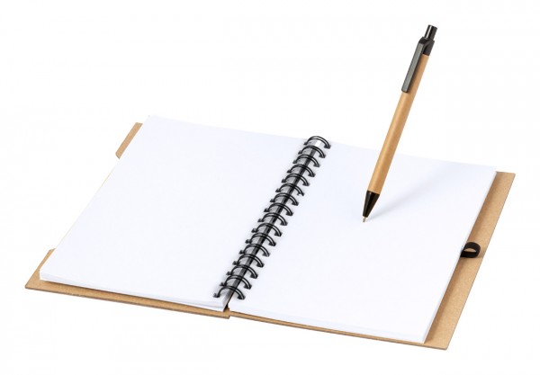 Recycled cardboard covered spiral notebook with 80 blank sheets, 25 sticky notes and 100 page markers (in 4 colours). Including a recycled cardboard ballpoint pen with blue refill.