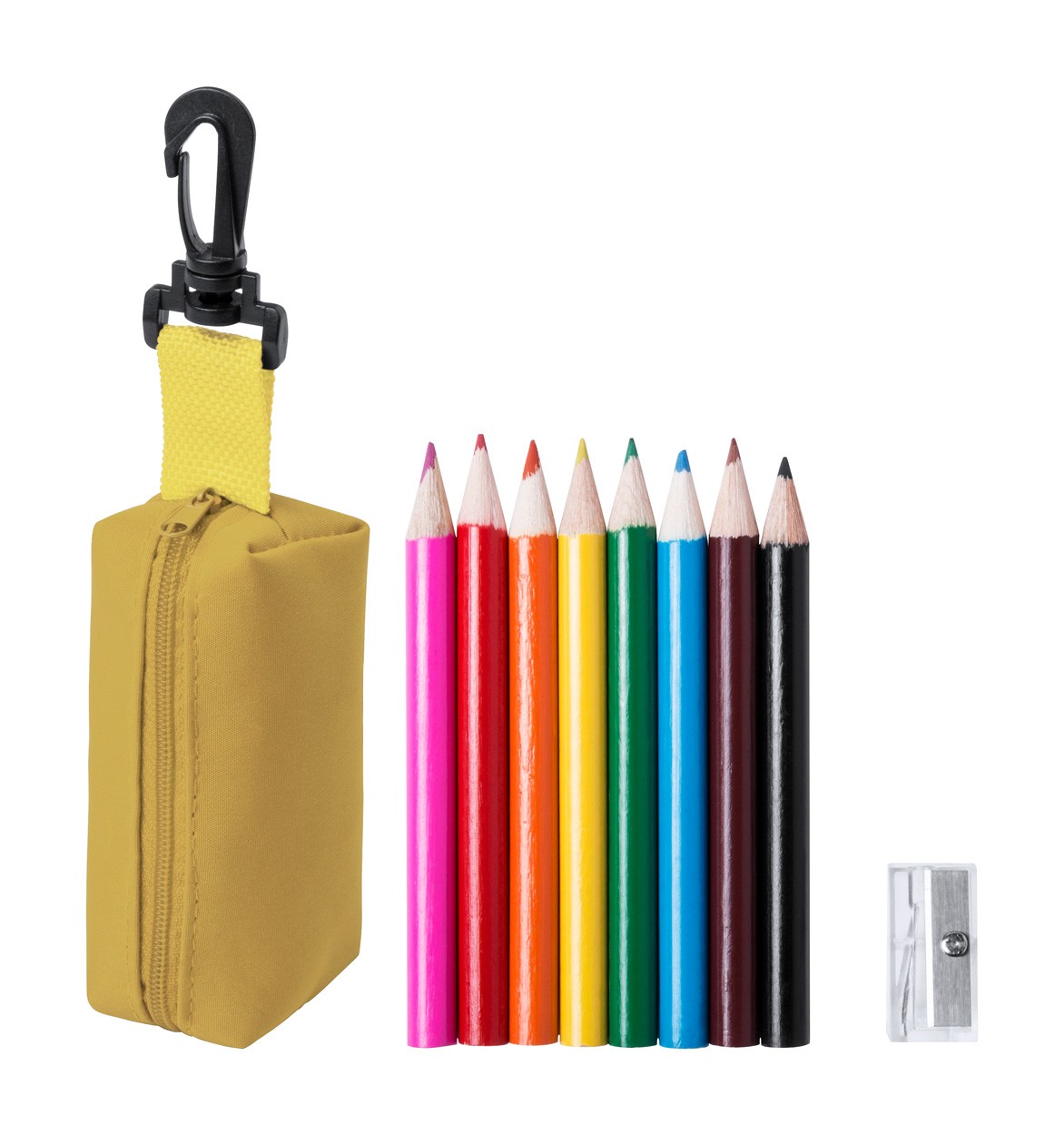 Set de 8 buc creioane colorate(ascuțite) din lemn și ascuțitoare. În suport din poliester 420D.