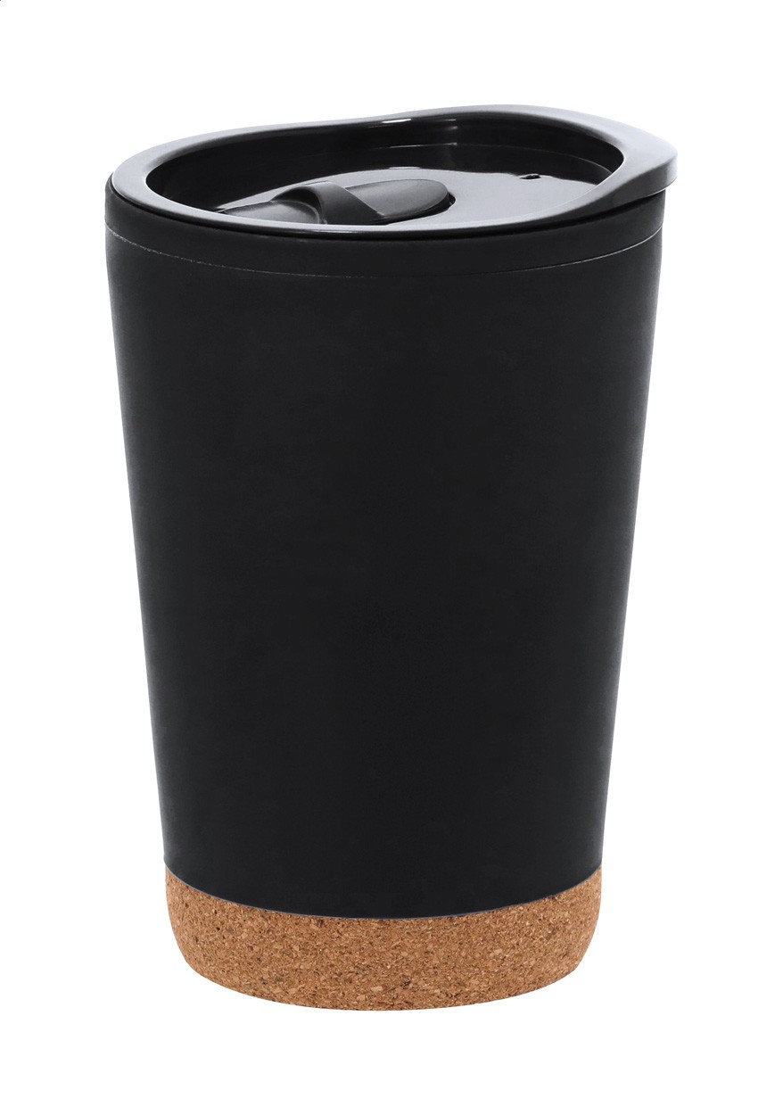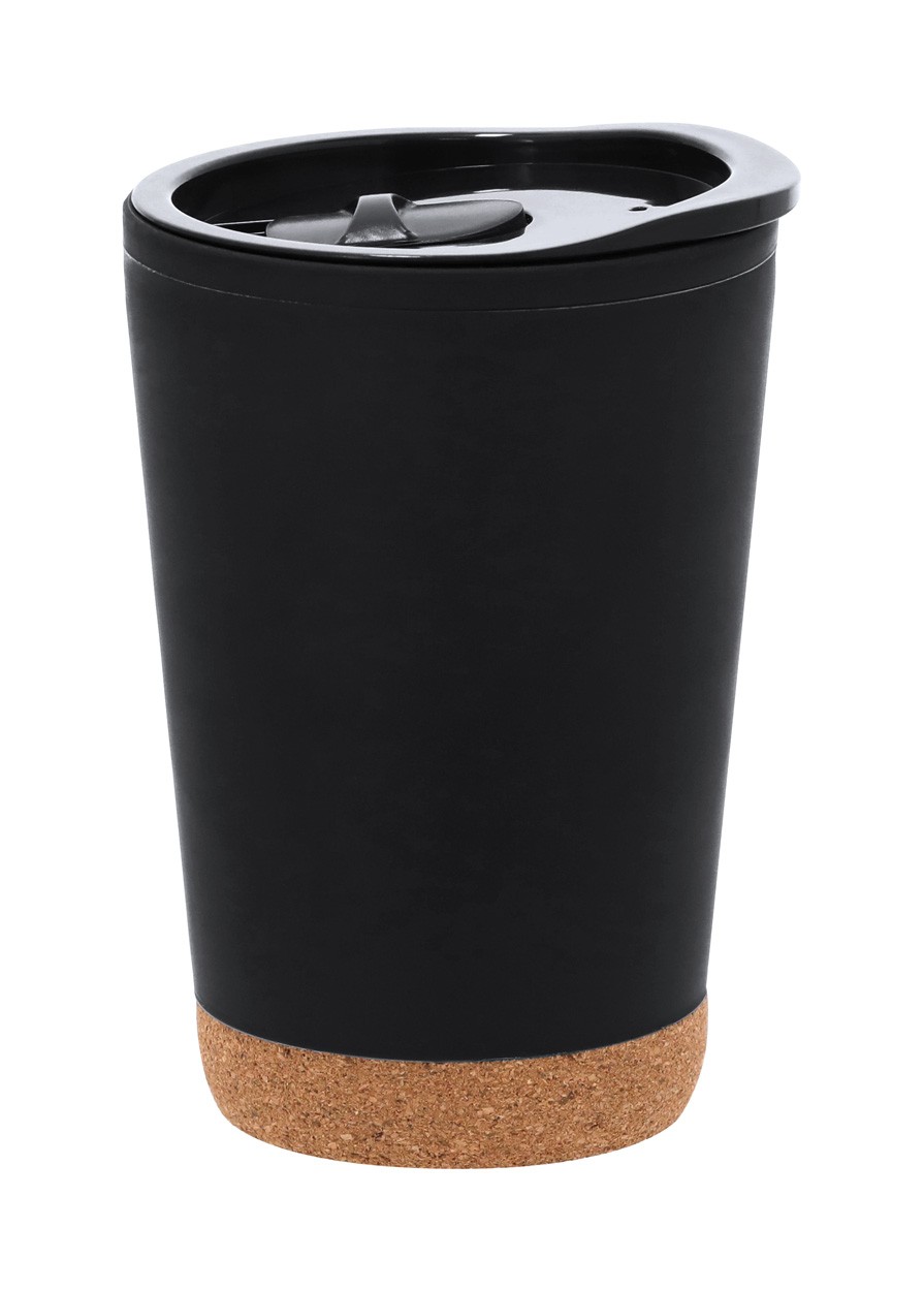 Cană termoizolată din plastic PP reciclat, cu perete dublu, cu capac de băut și bază din plută naturală, 260 ml.