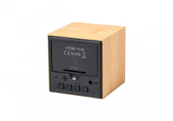 Bamboo-covered digital alarm clock with calendar, thermometer and white LED display with adjustable brightness. It can be powered through the included USB charging cable or with button cell batteries.