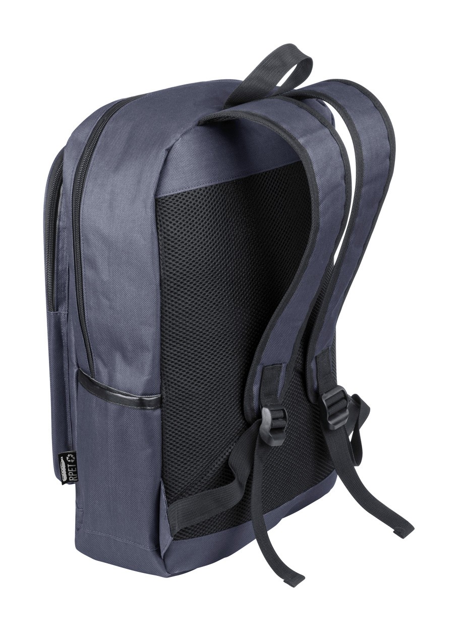 Rucsac RPET cu compartiment principal cu fermoar, 2 buzunare frontale cu fermoar, buzunare laterale si compartiment căptușit pentru laptop (15"). Cu spate și bretele căptușite. Poliester 600D RPET, cu etichetă distinctă RPET.