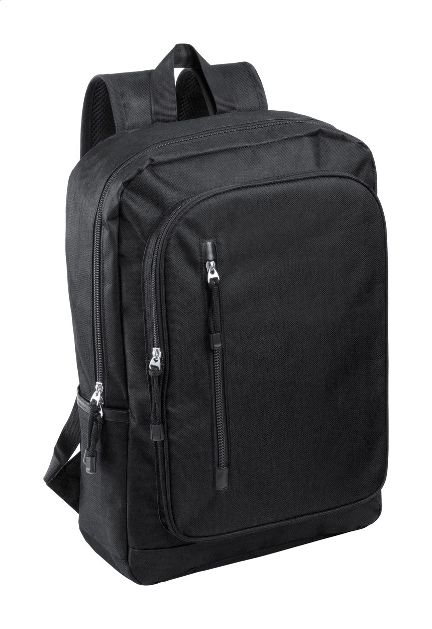 Rucsac RPET cu compartiment principal cu fermoar, 2 buzunare frontale cu fermoar, buzunare laterale si compartiment căptușit pentru laptop (15"). Cu spate și bretele căptușite. Poliester 600D RPET, cu etichetă distinctă RPET.