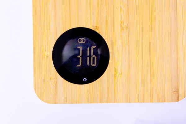 Tocător din bambus, cu bază anti-alunecare, funcție de cântar digital de bucătărie și afișaj LCD. Capacitate: 5 kg. Funcționează cu 2 baterii AAA, livrat fără baterii.