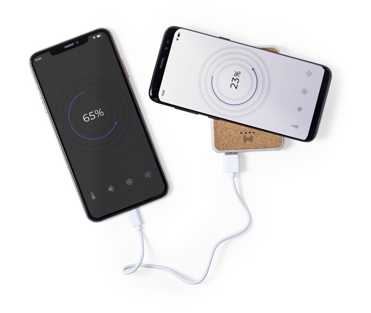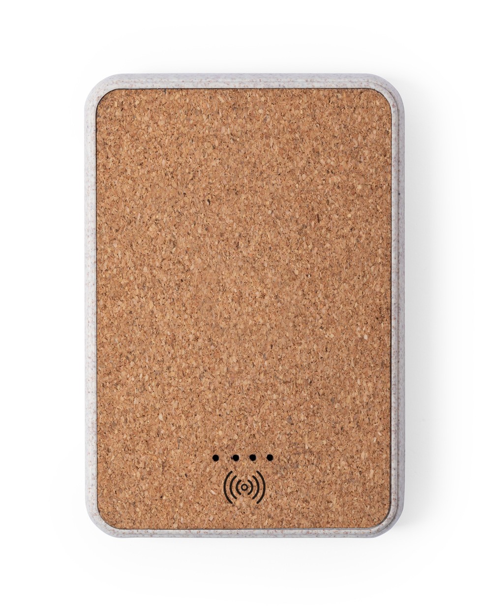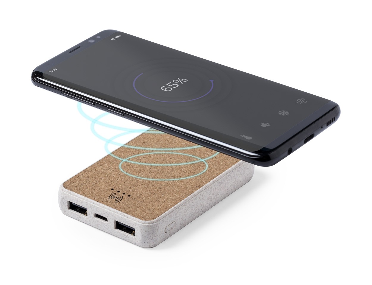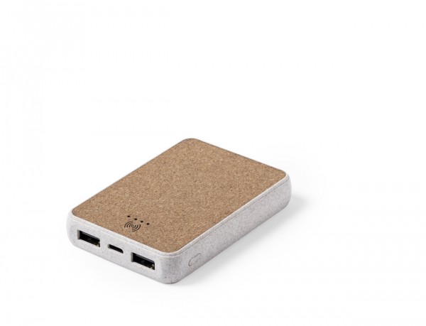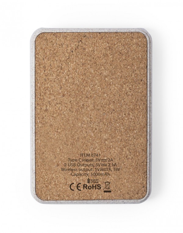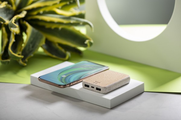 Baterie externa USB din plută naturală și paie de grâu cu baterie de 5000 mAh și încărcător wireless încorporat. Cu 2 porturi USB pentru încărcător. Bateria poate fi încărcată prin portul USB-C. Inclusiv cablu încărcător USB.