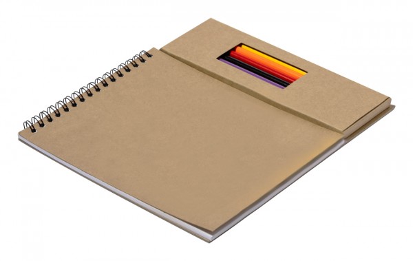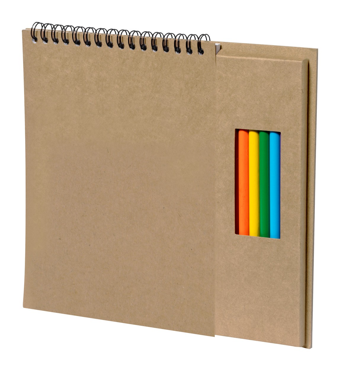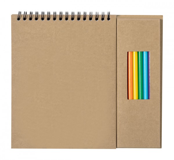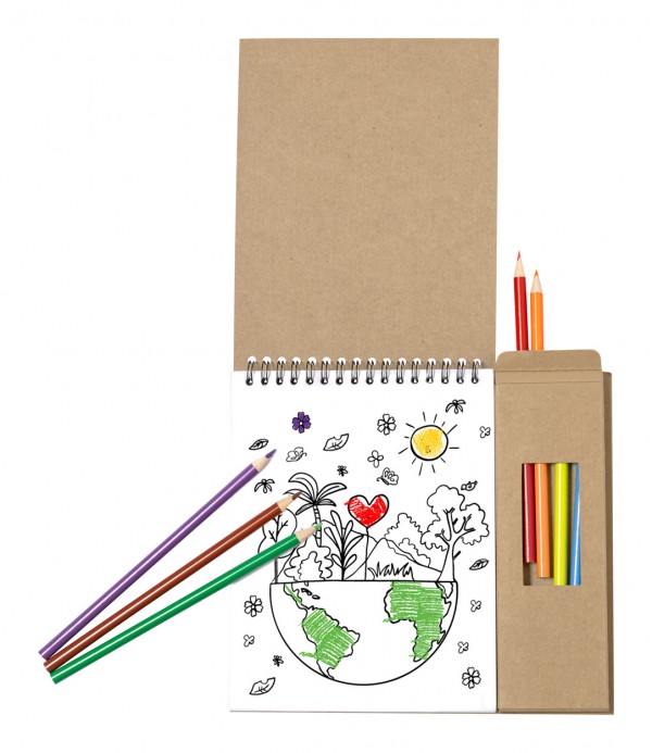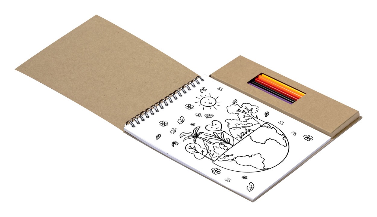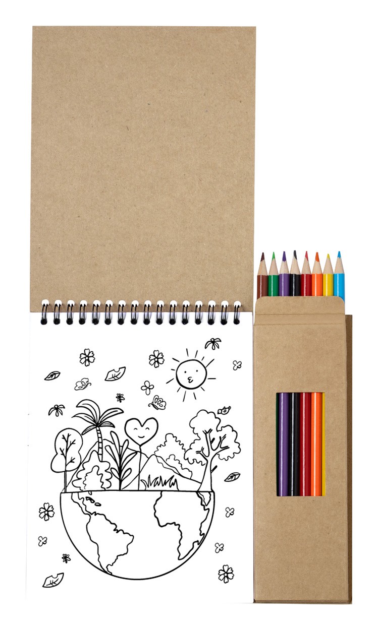 Colouring set with 8 colouring pencils in recycled cardboard box, and spiral colouring notebook with 24 sheets.