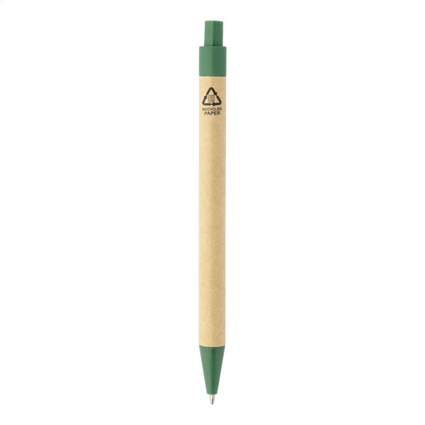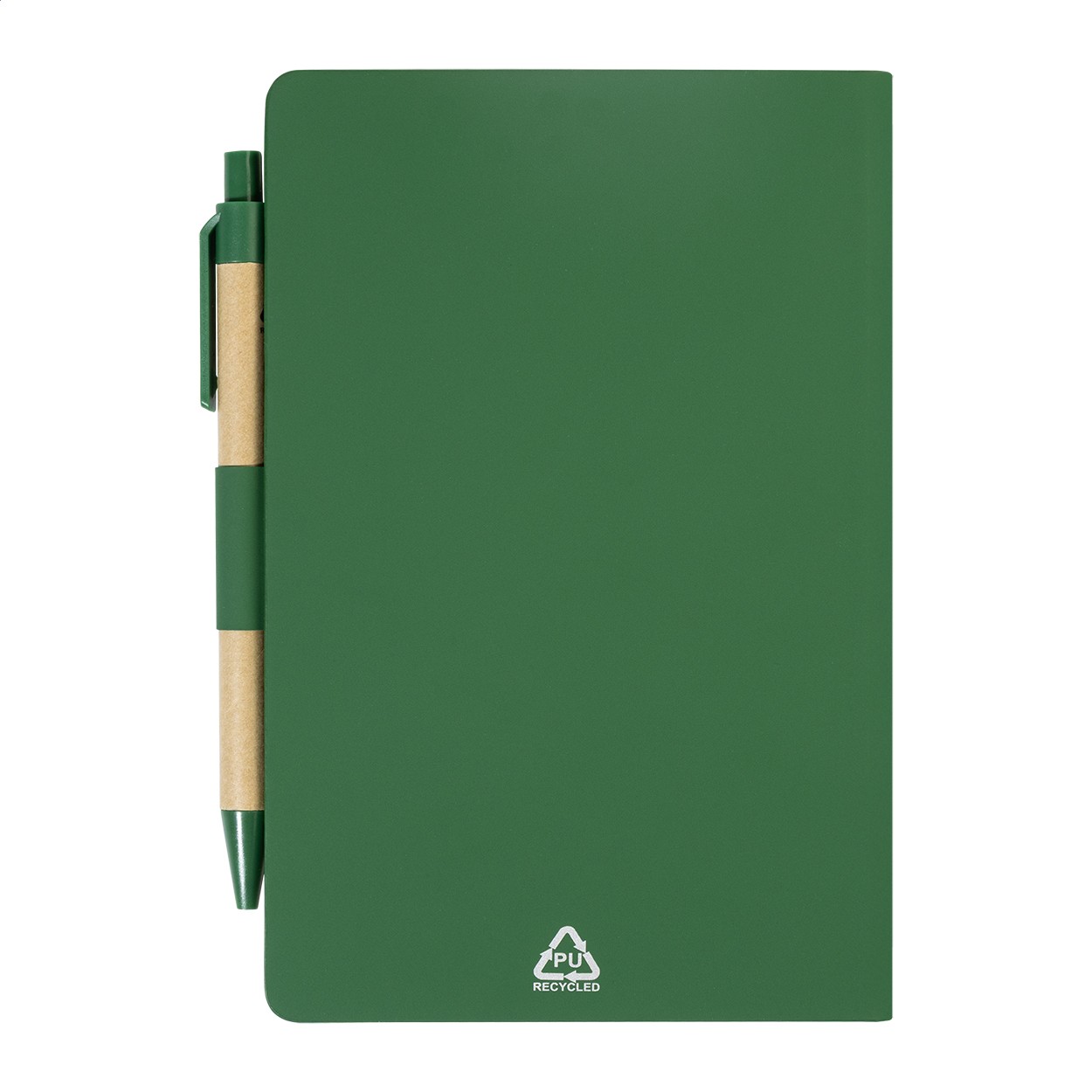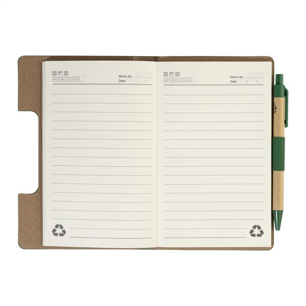 Caiet cu copertă din piele PU reciclată, cu 70 de file dictando, din hârtie reciclată și 125 de marcaje de pagină (în 5 culori diferite). Include hârtie reciclată și pix din PP reciclat cu refill albastru.
