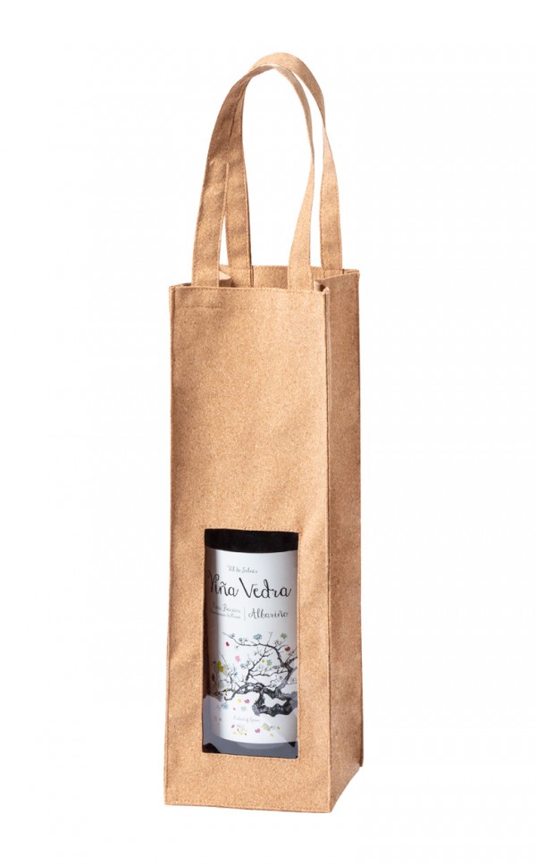 Geantă cadou din plută naturală pentru sticlă de vin cu geam frontal.