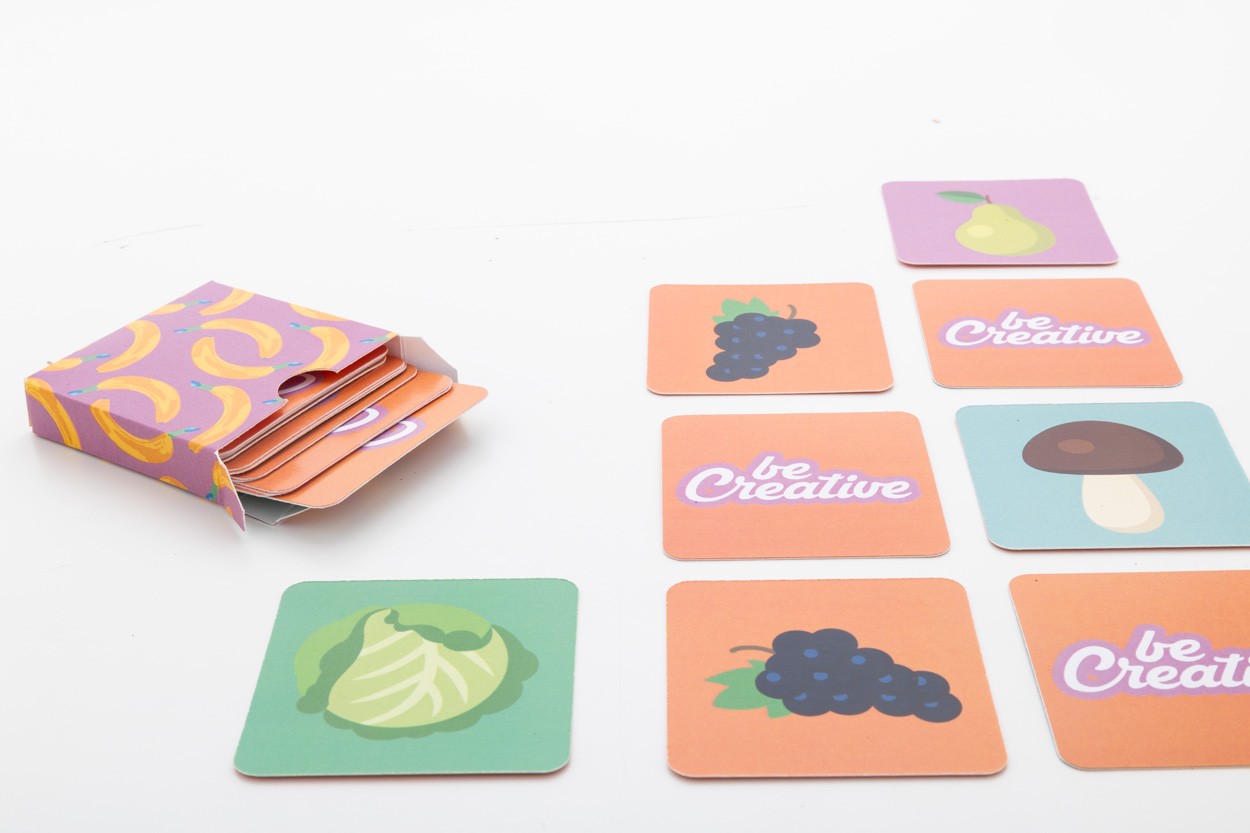 Joc de memorie, din hârtie, cu motive tematice, în cutie de hârtie personalizată. Cu 24 de plăci (55x55 mm). Prețul include imprimarea color pe spatele tuturor plăcilor și o cutie imprimată color. MOQ: 100 buc.