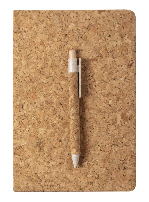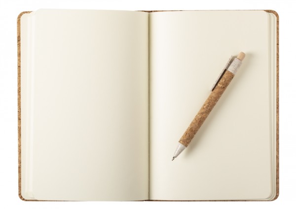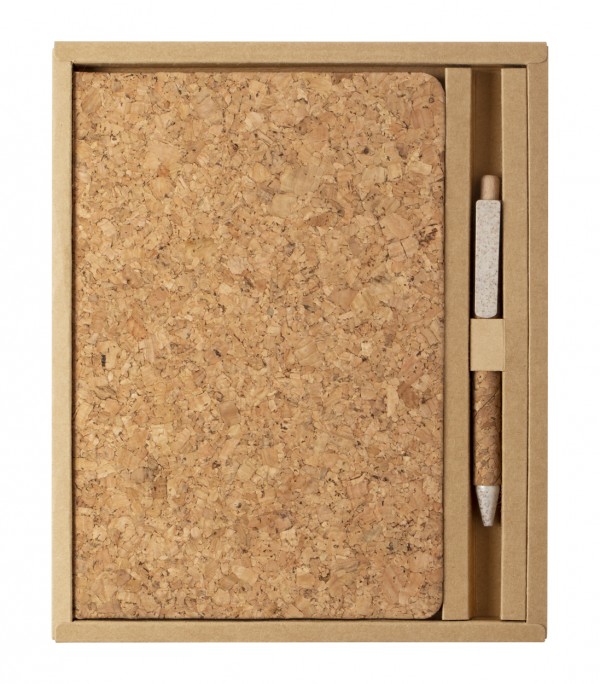 Set format din blocnotes acoperit cu plută naturală, cu 80 foi veline, dimensiunea A5 si pix din plastic de paie de grau cu plută, cu mină neagră. În cutie de hârtie kraft.