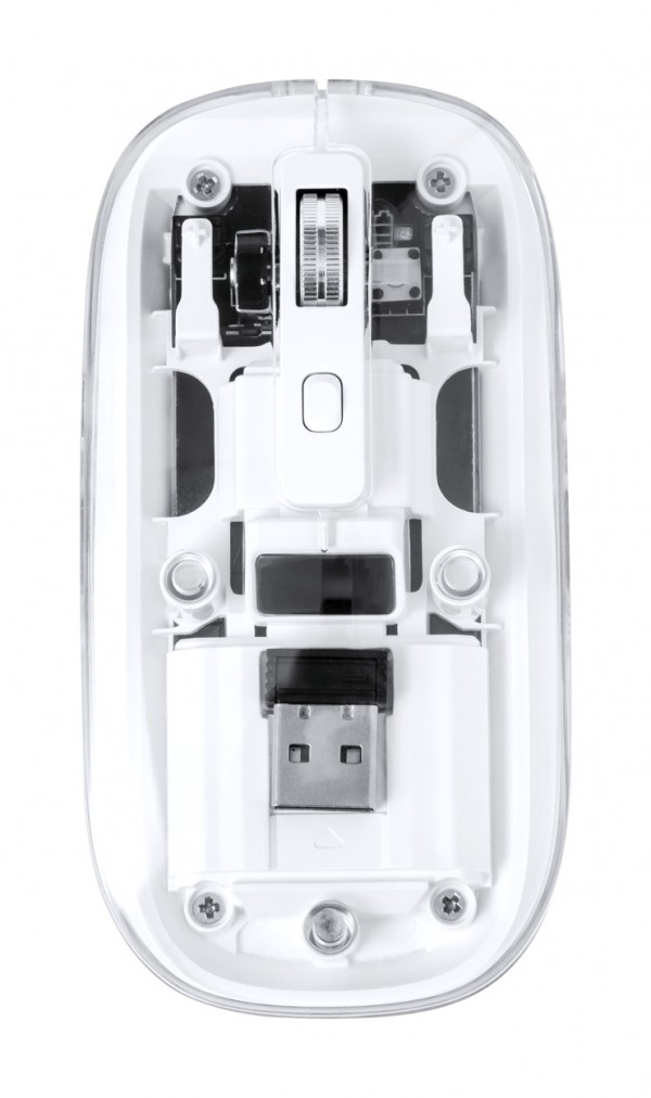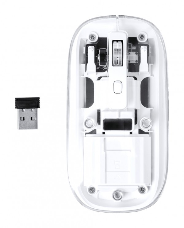 Mouse optic wireless, cu carcasă din plastic ABS transparent și baterie reîncărcabilă încorporată (300 mAh). Inclusiv cablu de încărcare USB.