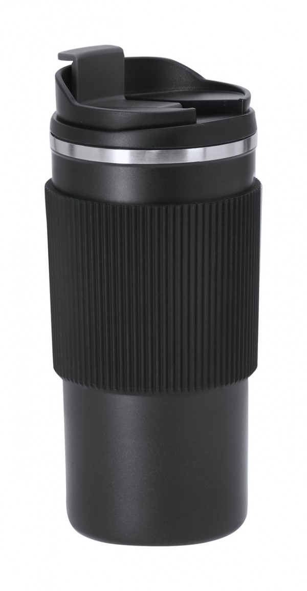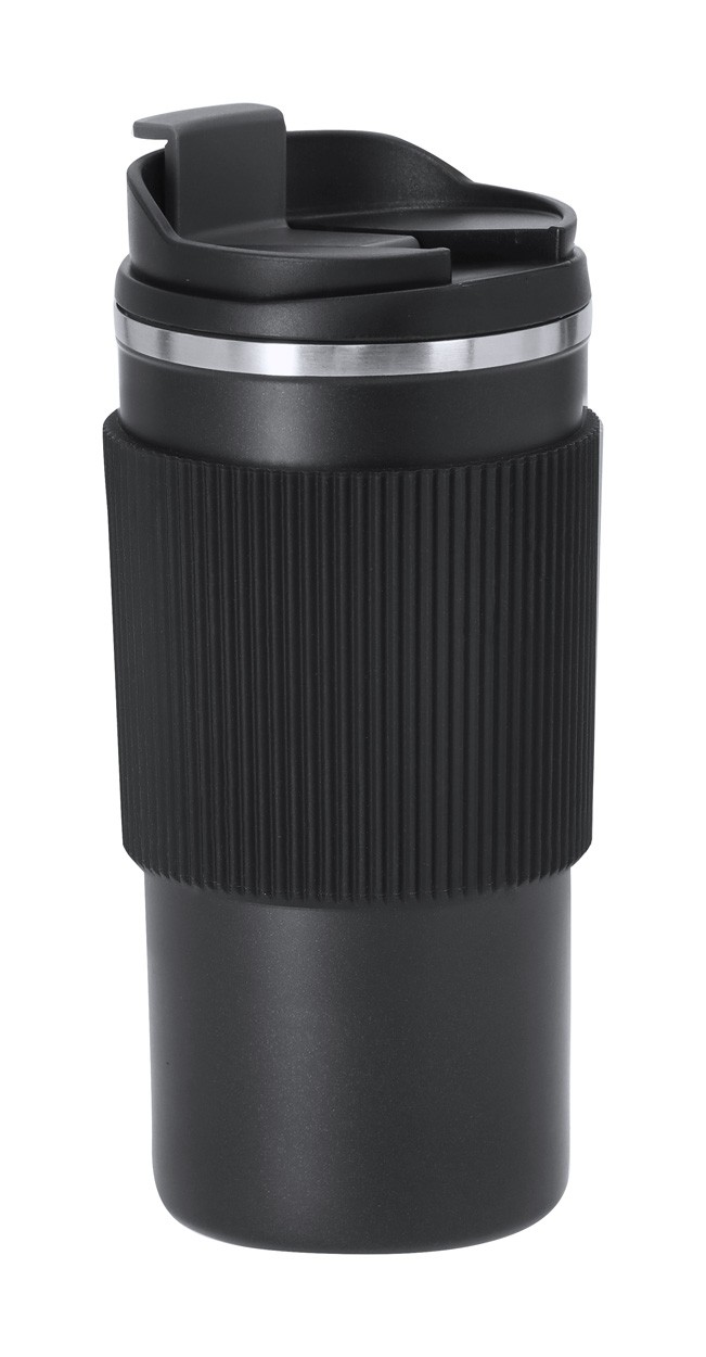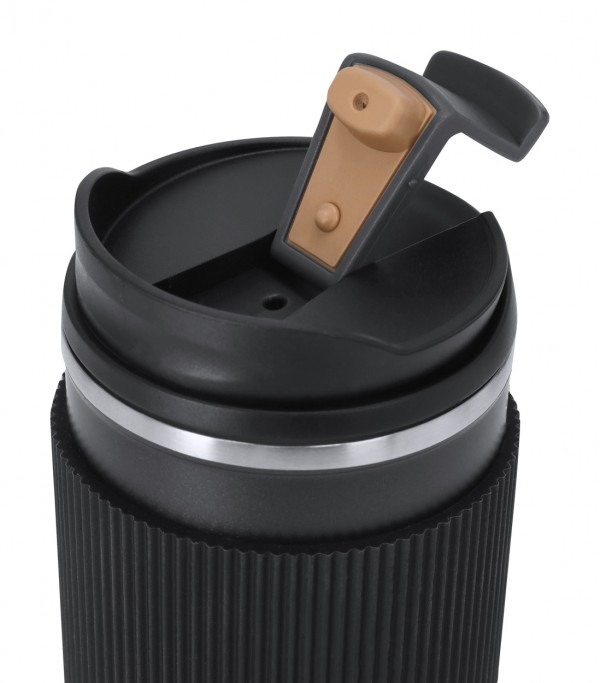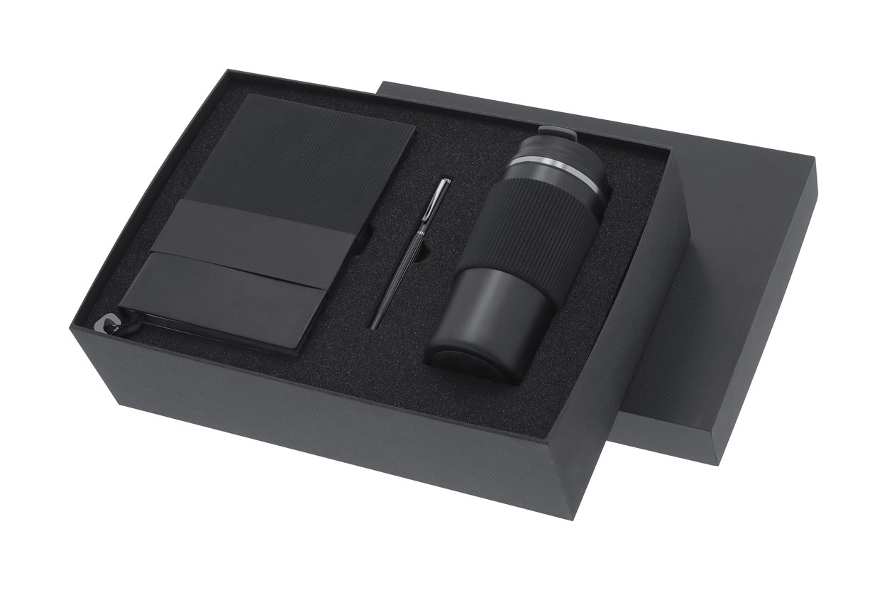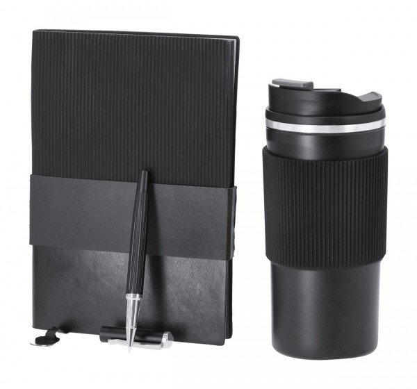 Set birou premium. Include: 1 agenda cu coperta din piele PU cu semn de carte și 100 de foi dictando; 1 stilou roller din aluminiu, mină albastră; 1 cană termo din oțel inoxidabil cu perete dublu, cu capac și bandă de silicon, 470 ml. Izolația menține băuturile calde timp de 3 ore și reci timp de 6 ore.
